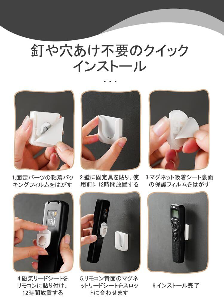 【取付け簡単&打孔不要】 マグネット リモコンホルダー 穴あけや工具は一切不要です。裏面の粘着テープを剥がし、ホルダーを壁、ガラス、タイル、家具などに取り付けるだけで簡単に設置できます。跡を残さずに剥がすことができるため、移動もスムーズです。注意:このホルダーは、表面が滑らかな壁にのみ使用可能です。