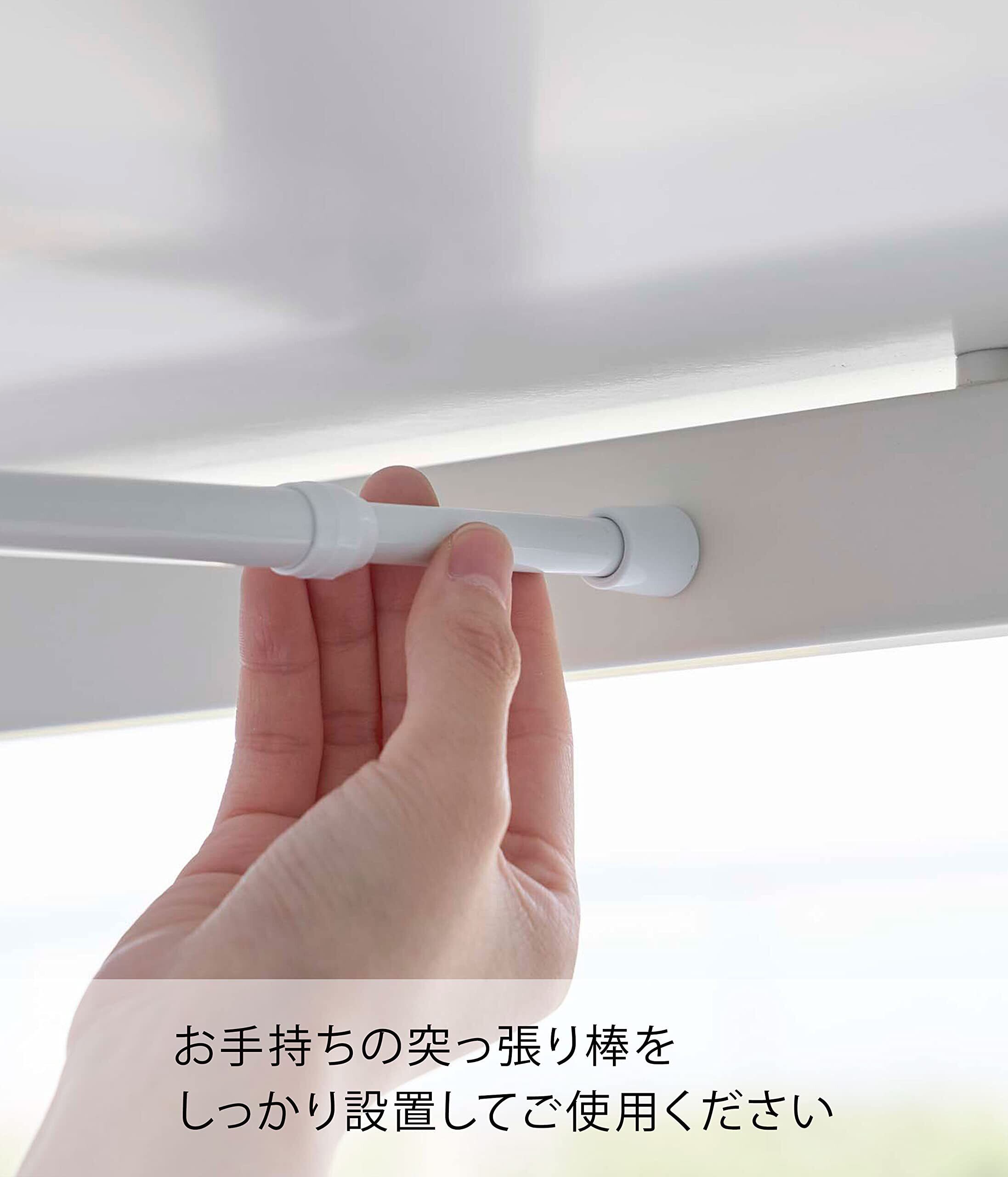 お使いのつっぱり棒にのせるだけの収納ラック!テーブルに穴を開けずに収納を増やせます。