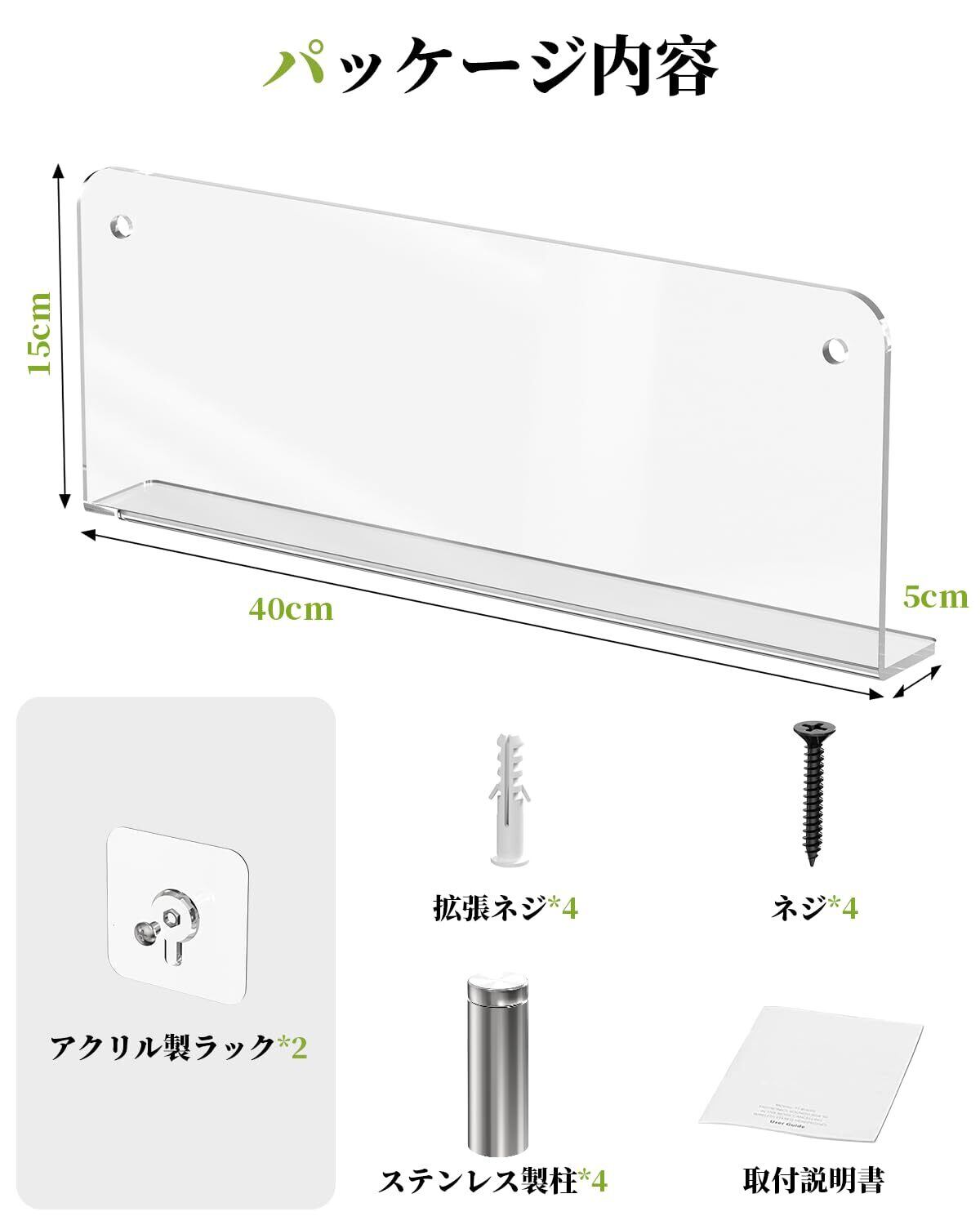 【商品仕様】サイズ:40*15*5cm 2個セット;材質:透明アクリル、ステンレス;耐荷重:25kg ;四辺は丸角で設計されており、鋭くなくて傷を防ぐことができます。※使用前にアクリルの保護フィルムが剥いでください。