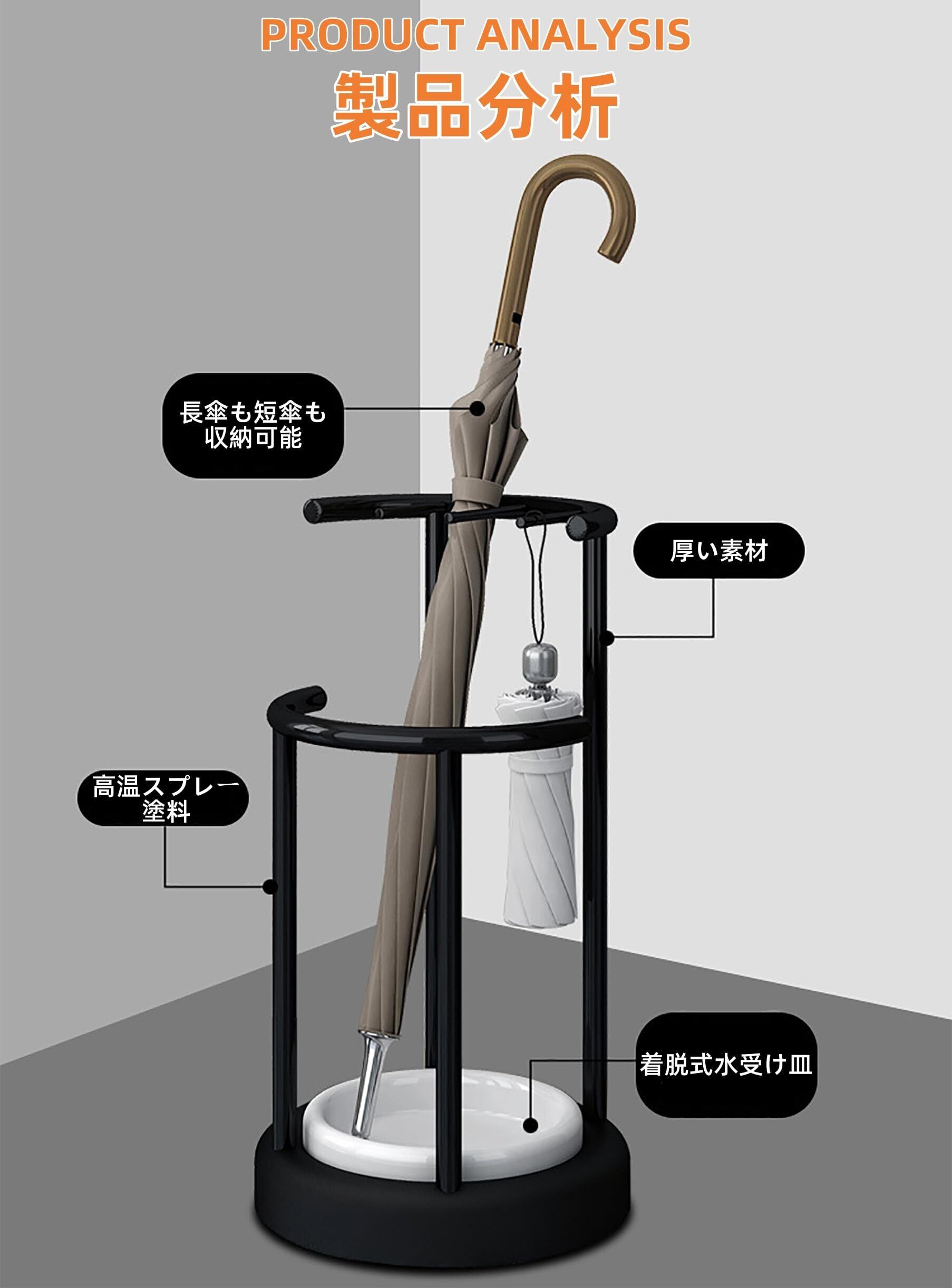 【高品質の素材】傘立ては丈夫で耐久性のある金属鉄+PPプラスチック製。外層の高温焼付け塗装処理、防水性、防錆性、耐腐食性。金属鉄のフレーム、PPプラスチック製ベースと水受け皿,安定した構造、頑丈で耐久性。