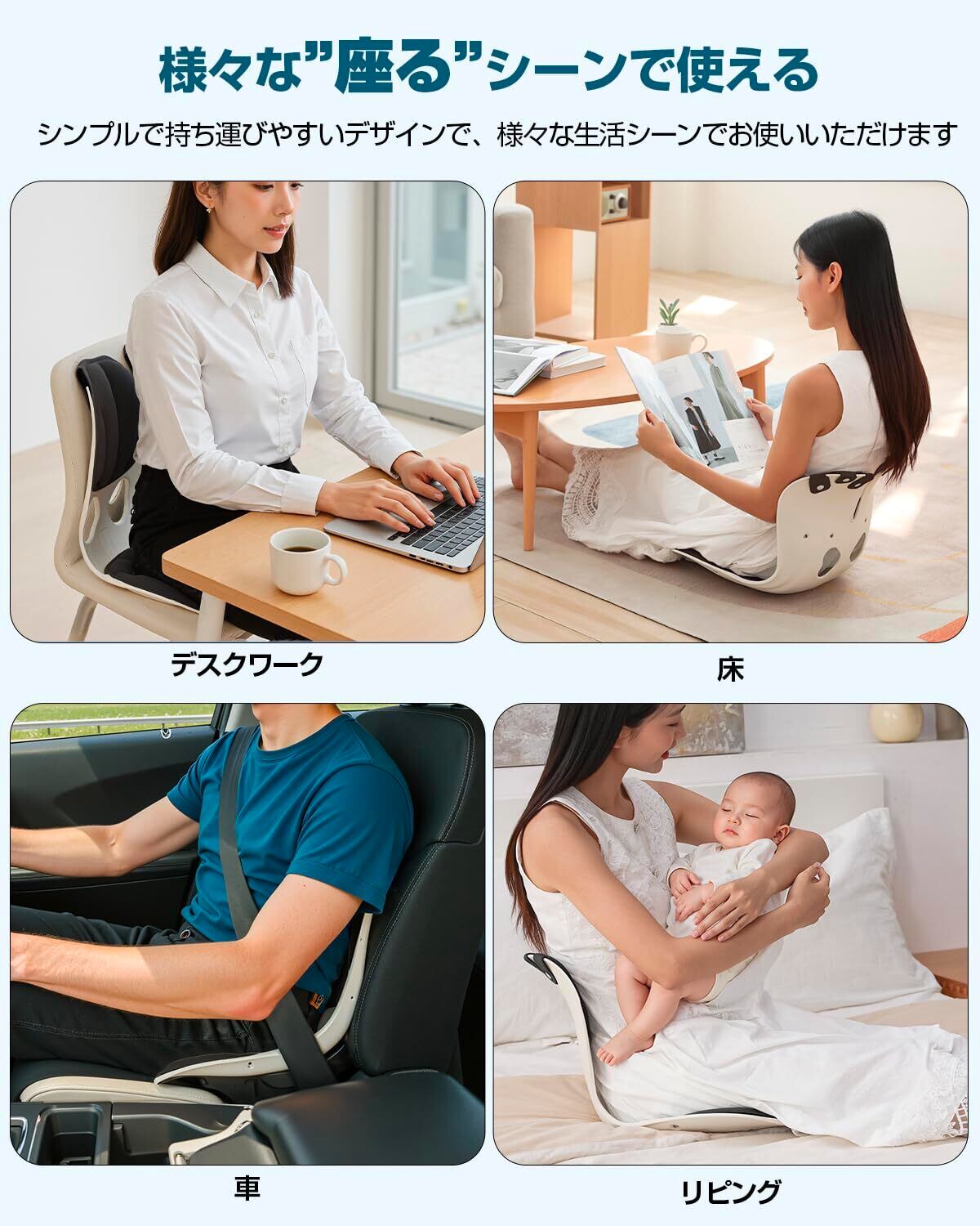 【軽さと携帯性抜群!どこでも使える】この「姿勢サポートチェア」は、その軽さと携帯性においても大きな魅力があります。従来の座椅子に比べて、驚くほど軽量で持ち運びが簡単。どこへでも手軽に持ち運ぶことができ、あらゆるシーンで活躍します。また、長時間の通勤・通学や出張、旅行などの移動時にも、この姿勢サポートチェアがあれば、車や電車の座席でも、まるで自分の椅子のように快適な座り心地を提供します。さらに、軽量でありながら、しっかりとした腰のサポート力を提供するため、どんな場所でも効果的に姿勢を矯正し、腰の負担を軽減します。特に、オフィスでのデスクワークや、車の運転中など、長時間座る機会が多い方にとって、このクッションはまさに必須アイテムです。携帯性を重視したデザインで、あなたの毎日をもっと快適にサポートしてくれる「姿勢サポートチェア」を、ぜひお試しください!