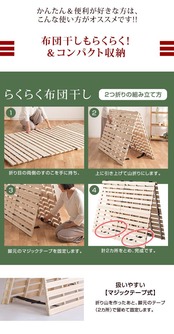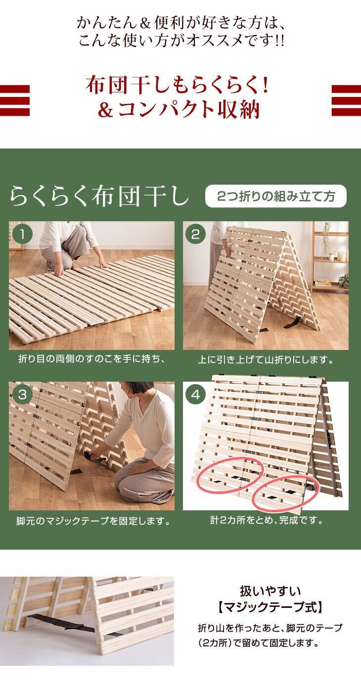 【特徴】通気性抜群のリブ加工 /・すのこギッシリ28枚!ごつごつ感を軽減 /・耐久性のあるすのこ厚1.3cm /・二つ折りにして布団干しも楽に! /・折りたたみ固定は簡単マジックテープ式 /・滑り止め付き
