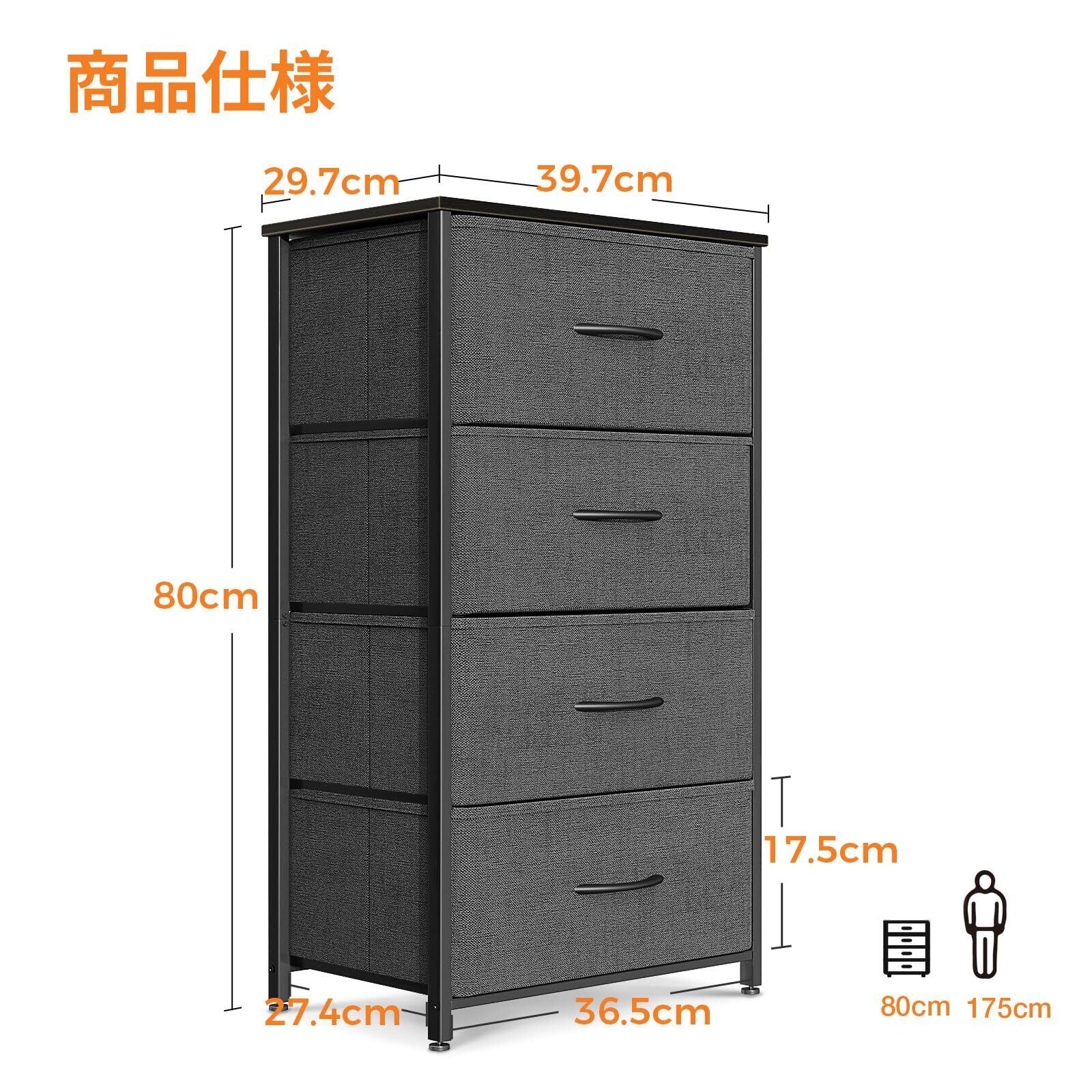 KKL チェスト タンス 衣類収納 収納ケース 引き出し リビング収納 布製 引き出し 衣装ケース 箪笥 転倒防止 低ホルム 安定感 4段 【幅40×奥行30×高さ80cm】 ダークグレー