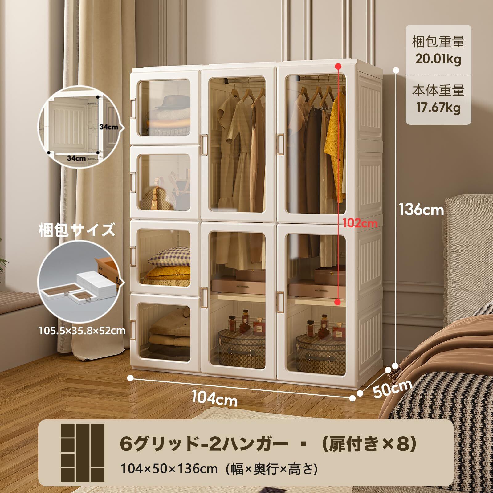 Mayi Box ワードローブ クローゼット 一体折りたたみ式 収納 扉付き 洋服ダンス ハンガーラック 大容量 衣類 雑物 防塵 省スペース 高耐荷重 新生活 おしゃれ (6グリッド-2ハンガー)