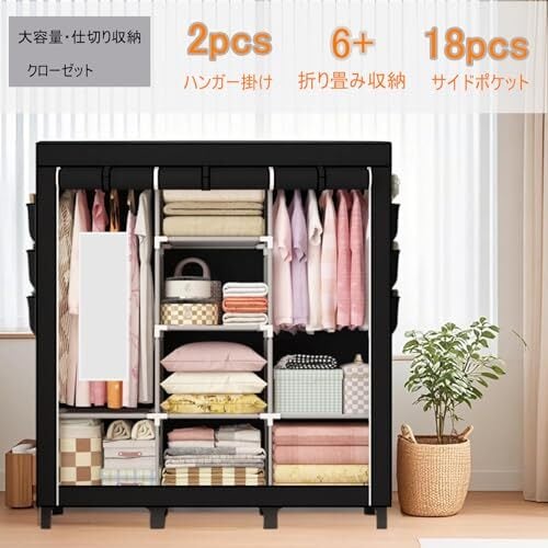 【大容量 & 合理収納クローゼット】このワードローブは、クローゼットと同じように強力な収納性能を備えながら、ハンガーラック カバー付きのような軽量性を兼ね備えています。内部にはそれぞれ 120 センチの超長ハンギングエリアが 2 つあり、ロングコートやワンピースドレスなどの長尺の洋服をシワなく吊るすことができ、洋服収納や服 収納に最適です。置物エリアは 6 つ以上設けられており、布団や枕、バッグなどを適切にクローゼット 収納できます。側面には 18 個の大きなポケットがデザインされており、靴下や下着、鍵、財布などの小物を分かりやすく収納でき、この洋服ラックの収納可能性を大幅に拡大します。また、天板の広いスペースは旅行用スーツケースを置くことができ、空きスペースを有効活用して、収納を整然とし、あなたの生活空間を快適にします