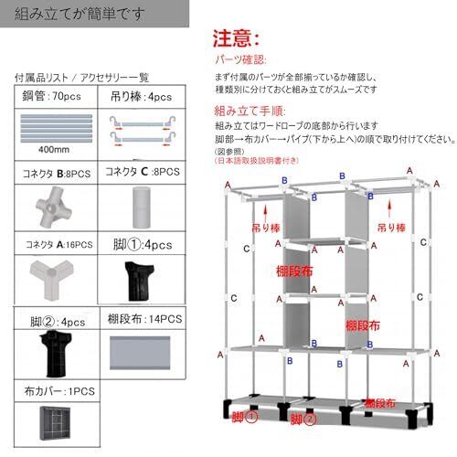 【超簡単組み立て工具不要,日本語の分かりやすい説明書に従えば、わずか数分で完成!パイプの長さは 1 種類のみで、部品を間違える心配ありません。女性でも一人く組み立てられる、快適な作業体験が魅力的な【カバー付きハンガーラック付き簡易クローゼット】,ワードローブクローゼットとしての収納性能に加え、カーテン付きハンガーラックやパイプハンガー付きの柔軟なレイアウトで、衣類整理がスッキリ