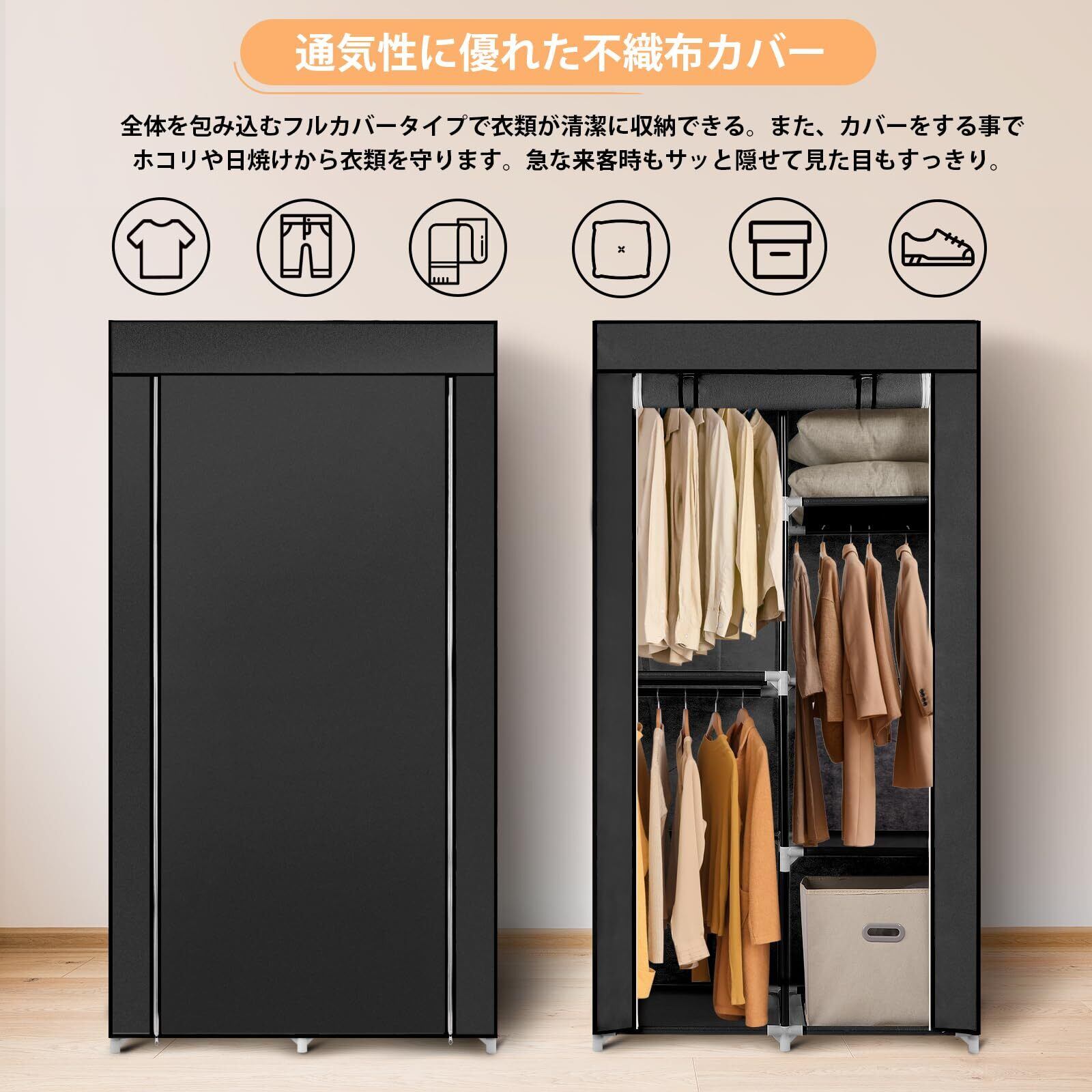 AZAKBLワードローブ カバー付き クローゼット 不織布 直径19mmのスチールパイプ 大容量 ハンガーラック 簡単組み立て式 衣類 収納 省スペース防水 防塵 防汚 耐用 幅 88×奥行44×高さ165cm (ブラック)