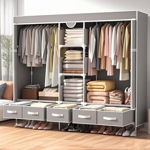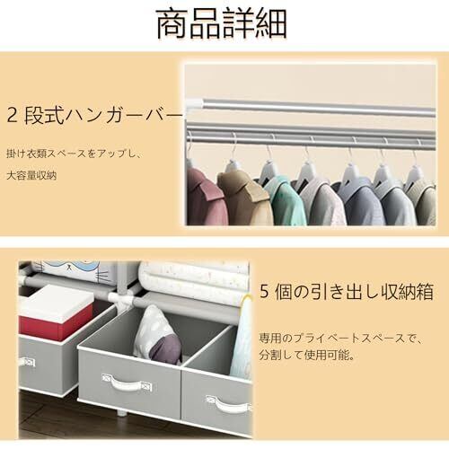 【大容量 5 引き出し × 防塵カバー付】クローゼット ワードローブ 多層収納 洋服・ダンス衣装・靴・帽子収納 簡単組立 簡易 寮/寝室向け 幅 185× 奥 45× 高 175cm グレー