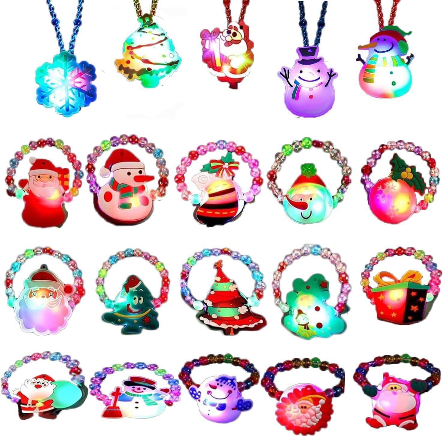 【大容量クリスマスおもちゃセット】光るブレスレット15個と光るネックレス5個の、合計20点の豪華セットです。LEDで光るカボチャ、コウモリ、クモ、ゴースト、ドクロ、一つ目など、様々なキャラクターデザインが含まれています。(※デザインや色はランダムな組み合わせです。お届けする種類の指定はできませんので予めご了承ください。)