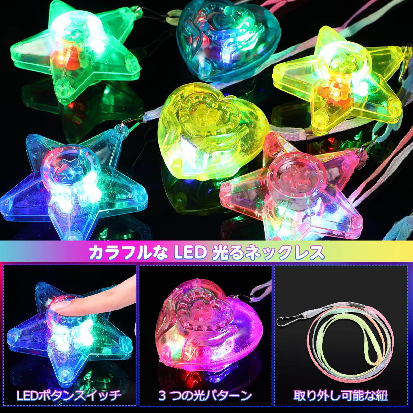【LED点滅で目を引く光るおもちゃ!】それぞれのペンダントは高品質なLEDを搭載しており、暗い場所でも存在感抜群です。美しい点滅を楽しむことができるため、クリスマスパーティーや縁日、子供会など、様々なシーンで盛り上がるアイテムとして最適です。