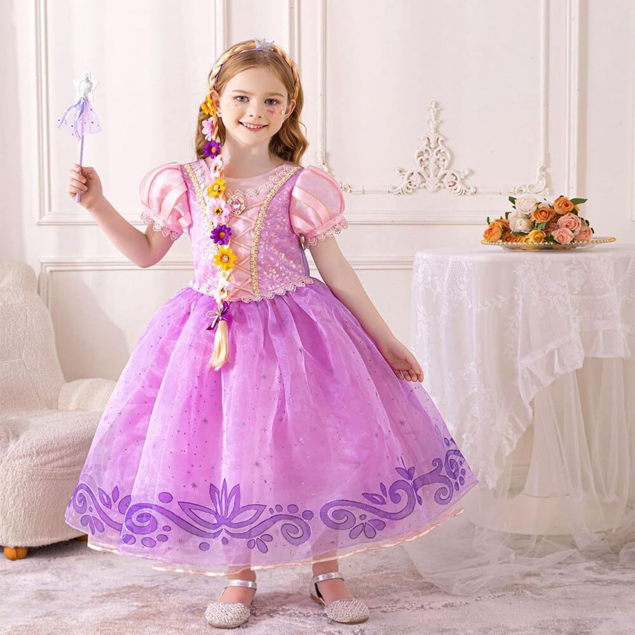 【高品質】ラプンツェルの髪にはリボンと本物そっくりの繊細な花が絡み合っていて、てっぺんにはキラキラと輝く小さな王冠、一番下にはキュートなリボンがついています。非常にまぶしい、あなたの娘を王女のように輝かせてください、プリンセスの夢を叶えます。
