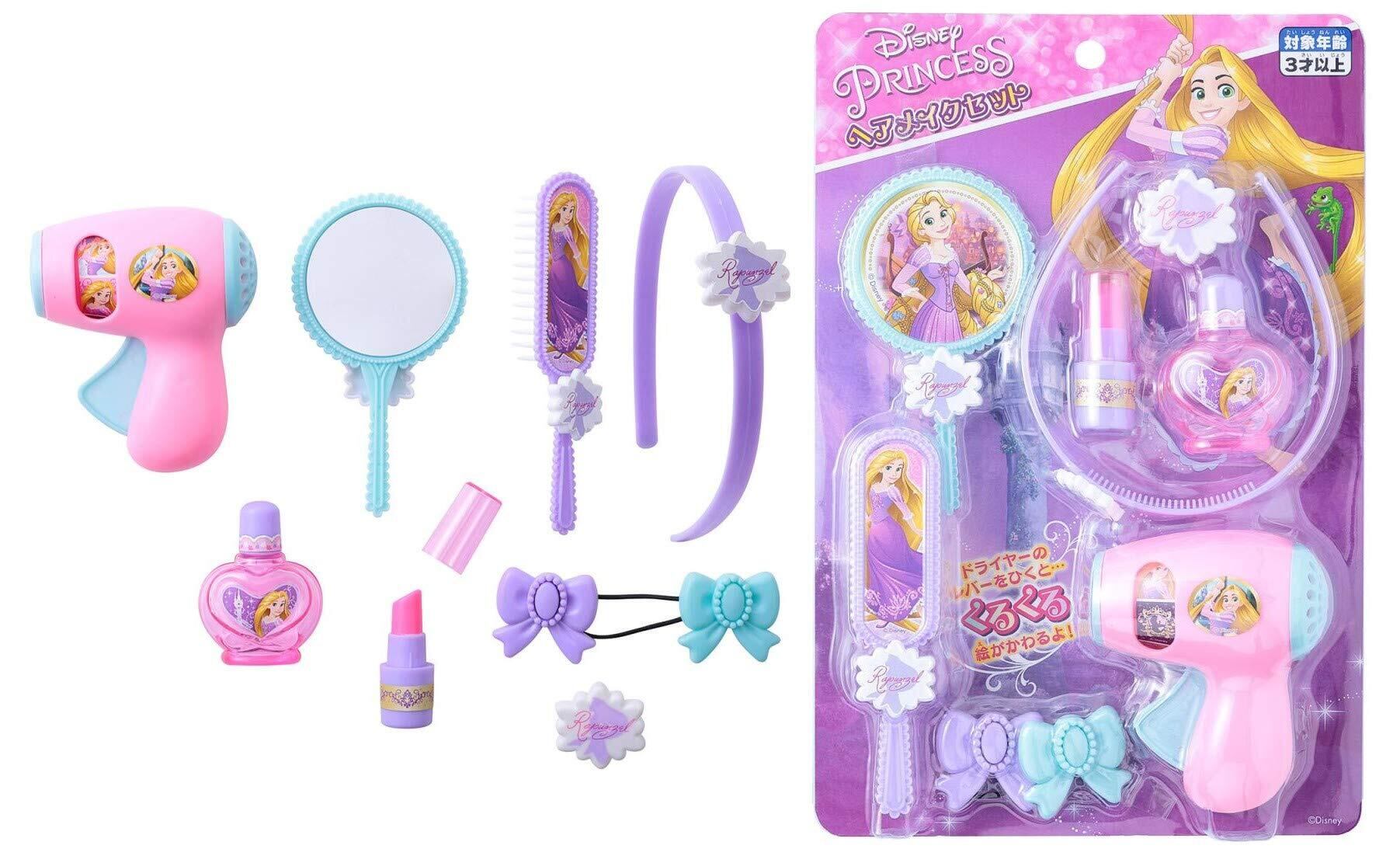 人気のディズニープリンセス ラプンツェルをイメージしたかわいいヘアメイクセットです。ドライヤーのレバーをひくとくるくる絵が変わるよ! ドライヤー、ヘアゴム、ボトル、ブラシ、鏡、カチューシャ、ヘアクリップ、口紅が入っています。