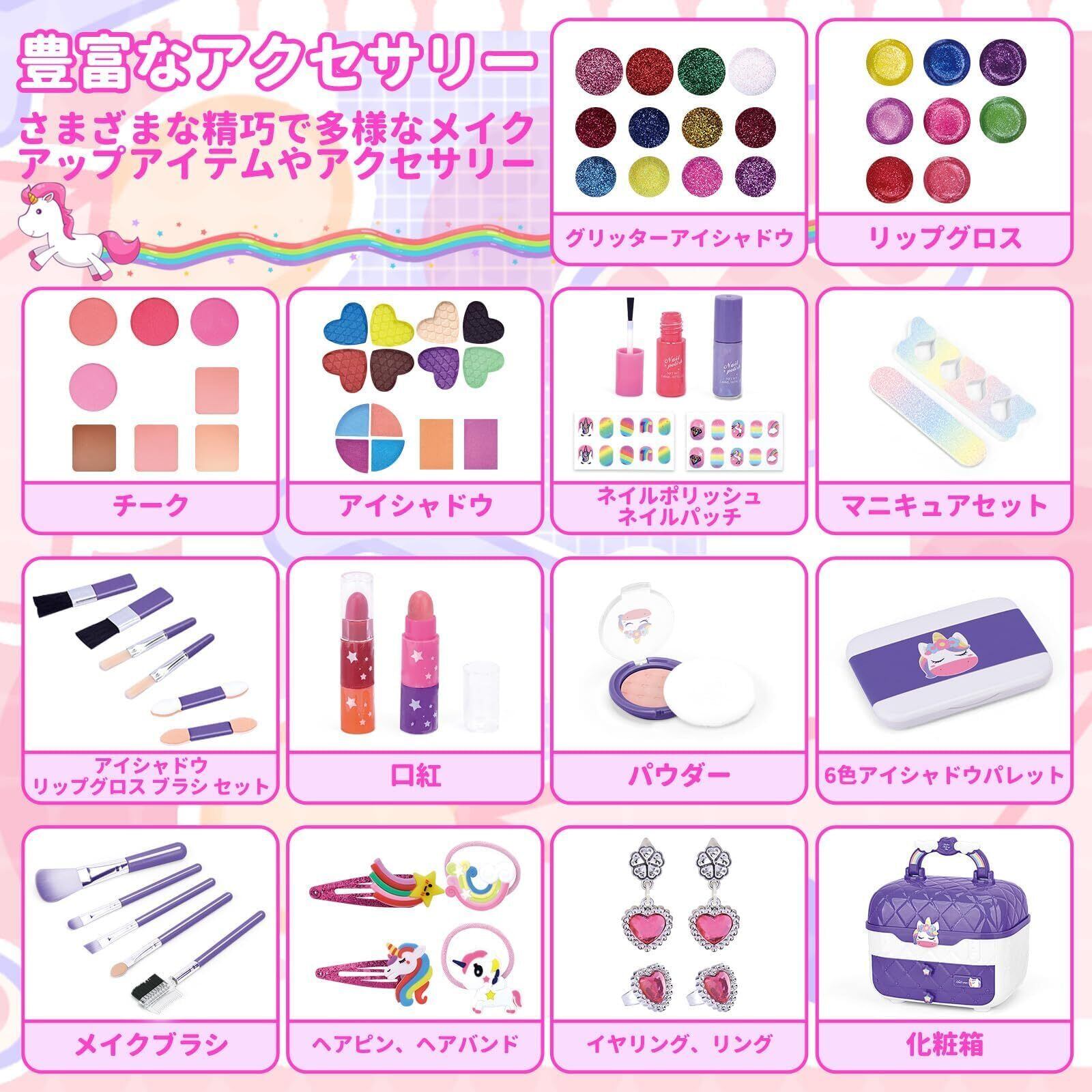 【すべてを満たす72点セット!】 - この豊富な子供用化粧品セットは、72点が含まれています:アイシャドウ(17種類のグリッター、14色のマット、6色のポータブルアイシャドウパレット)、リップグロス、チーク、リップスティック、メイクブラシ、ネイルポリッシュ、ネイルシール、ネイルファイル、鏡、ユニコーンのヘアクリップとヘアゴム、2対のピアスおよび化粧鏡。子供の様々な打扮のニーズを満たし、化粧セットの最良の選択です!