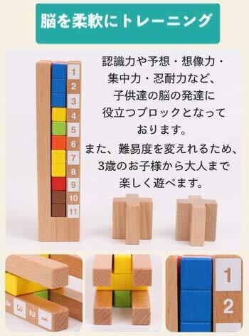 【安全・安心な素材の使用】この育脳タワーは、厳選された天然木材を使用しており、全てのエッジが滑らかに仕上がっているため、小さなお手でも安心です。また、環境に優しい無害な塗料が使われているため、親子で安心して楽しめるおもちゃです。遊びの時間が安全に保たれることを大切にしています。