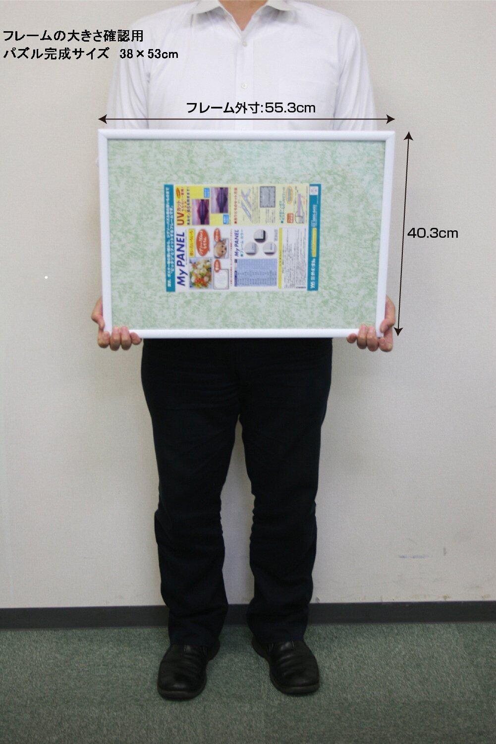 ジグソーパズル用アルミ製フレームNo.5-B。対応パズルサイズ:38×53cm。色:ホワイト。UVカットセルカバーが付属していますので、色あせ、劣化を防ぎます。バネ状トンボを使用しているため、パズルよりも薄い賞状やポスターなどもしっかりフレームに挟み込むことができます。光を通す素材のジグソーパズルには対応しておりません。