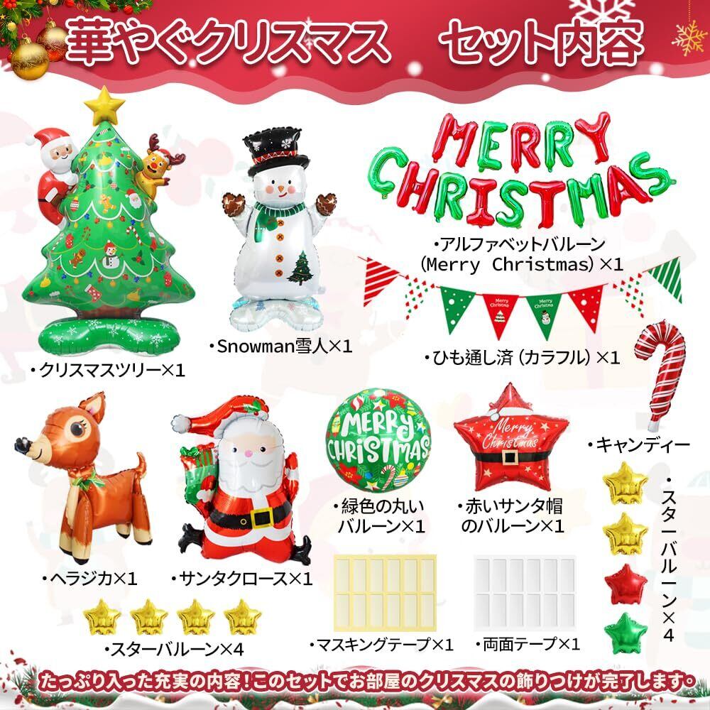 商品詳細:①Merry Christmas風船各文字×1 ② Merry Christmasガーランド×1 ③Bigサイズ風船:クリスマスツリー×1、サンタクロース×1、ヘラジカ×1④中型サイズ風船:逃走サンタクロース×1、赤い星×1、緑色の丸い風船×1、キャンディー×1⑤星(レット×1、グリン×1、ゴールド×2)⑥ゴールドの星⑦小道具キット(リボンひも、両面テープ、マスキングテープ) ⑧説明書(日本語)