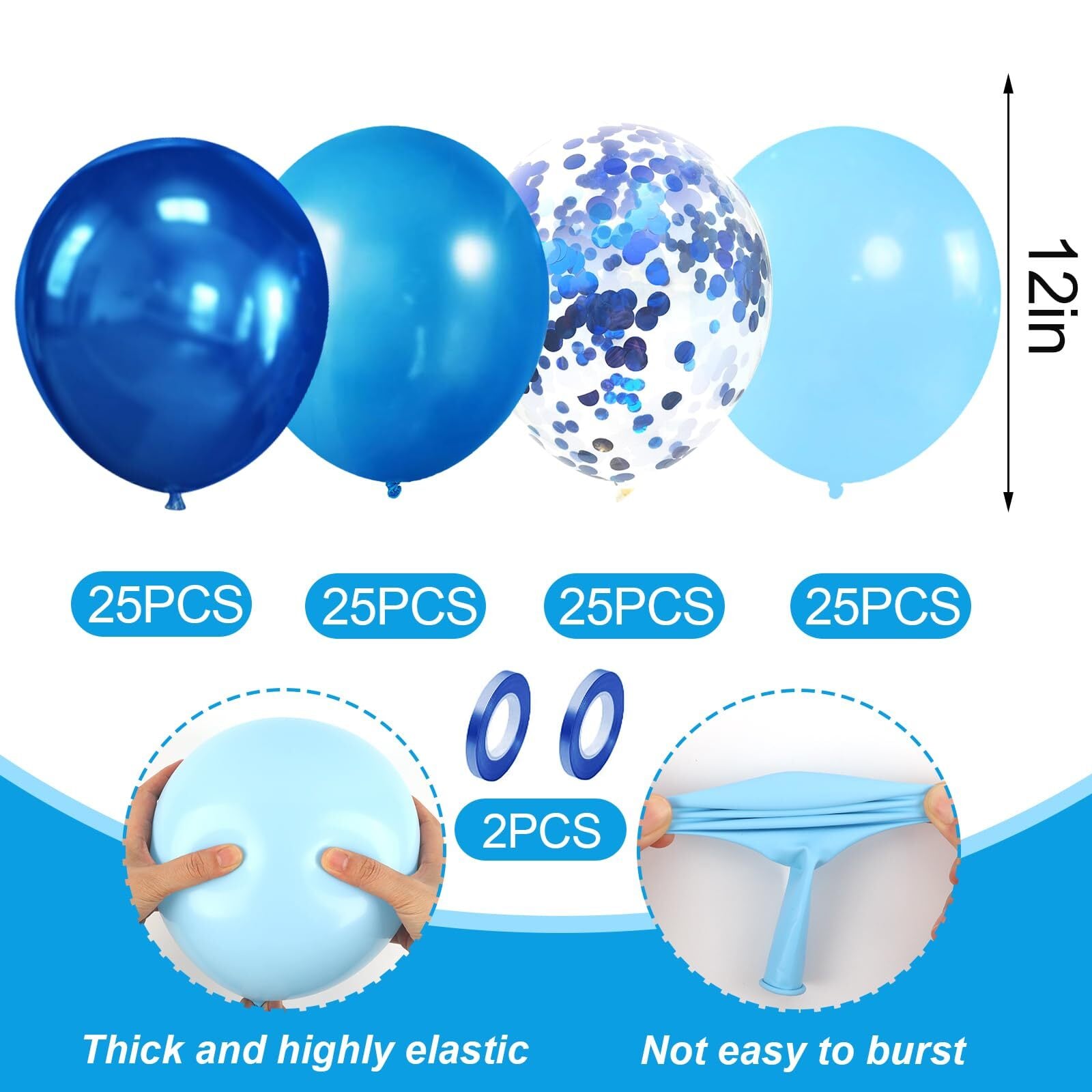 【ブルーバルーンセット】12インチのブルーをテーマにしたバルーン100個(ダークブルーのバルーン25個、ライトブルーのバルーン25個、コンフェッティブルーのバルーン25個、ブルーのバルーン25個)をお届けします。バルーンと陽気な雰囲気がパーティーに演出されます。