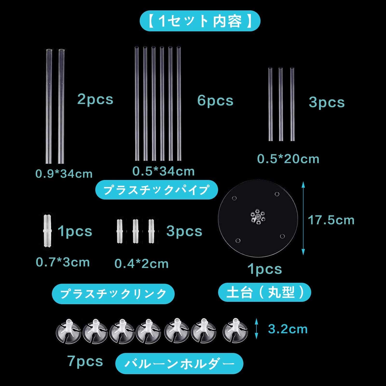 商品名:バルーン スタンド 風船 1個セット 1セット内容: 1.バルーンスタンド土台(丸型)1個(17.5cm) 2.プラスチックパイプ11pcs(0.9*34cm/2pcs, 0.5*34cm/6pcs, 0.5*20cm/3pcs) 3.プラスチックリンク4pcs (0.7*3cm/1pcs, 0.4*2cm/2pcs) 4.バルーンホルダー7pcs (3.2cm) 5.12inch風船7pcs(30cm) こちらは2セットで販売x2なります。