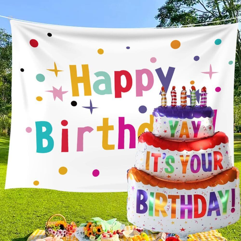 【大きいサイズ】タペストリー 約90×70cm、ケーキバルーン 約100*63cm、誕生日パーティーの装飾やパーティーでの写真撮影に十分な大きさで、誕生日パーティーに特別なタッチを追加します。