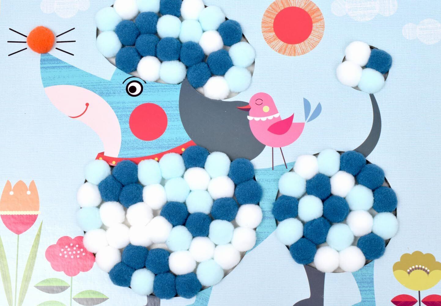 【ポンポンを貼ってふわふわの絵が完成】【立体感のあるアート】【コラージュ】カラフルな綿でできたポンポンで、ワンちゃんの絵を仕上げましょう。立体感のある絵はインパクトがあります。お部屋のインテリアにぴったり!説明書つきなので子供から大人まで誰でも楽しくアート体験ができます。