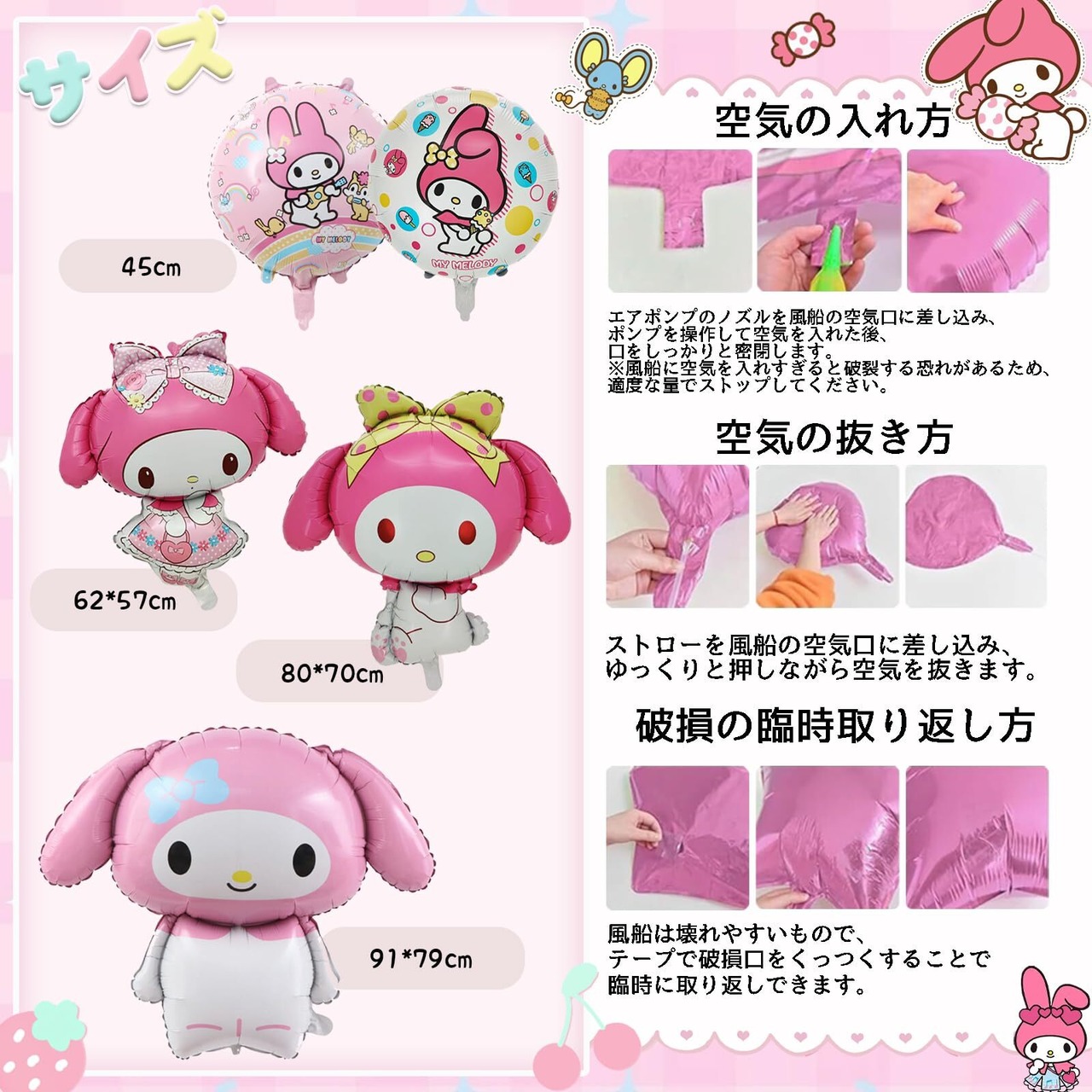 5 種類のキャラクターバルーンで楽しさ倍加:マイメロディをテーマにしたキャラクターバルーン x5 がそれぞれ独特のデザインで登場!アルミバルーンの質感が光を反射し、アニメパーティー風船バルーンの魅力を最大限に発揮。ファンたちに大きな驚きと喜びを届けます。