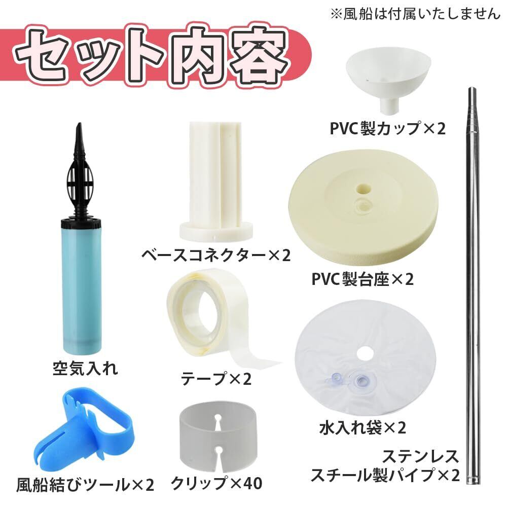 【セット内容】パイプ×2本 PVC製台座×2点 水入れ袋×2点 PVC製カップ×2点 ベースコネクター×2点 テープ×2巻 クリップ×40点 風船結びツール×2点 空気入れ×1点 ※風船は付属しません。【サイズ(約)】直径:21cm 高さ:46cm/77cm/110cm/140cm/173cm/205cm ※6段階