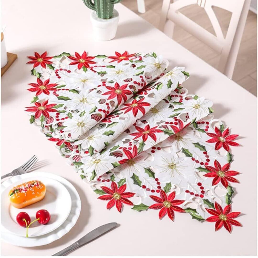 【デザイン】赤いクリスマスの装飾と緑のヒイラギのホワイトい背景、全体の絶妙な刺繍と目を引くオープンワークは、あなたのクリスマステーブルをより豪華でさわやかなプレスにします