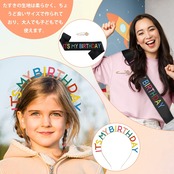 「虹色文字たすき」たすきの生地は柔らかく、ちょうど良いサイズになっており、大人でも子どもでも使えます。虹色の文字はカラフルでおしゃれ、誕生日パーティーのシーンに最適です。