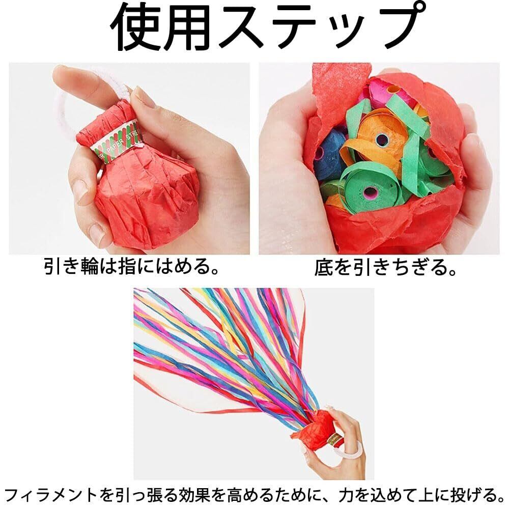 【使用方法は非常に簡単!】手に持って軽く投げるだけで、カラフルなリボンが美しく舞い上がります。何よりも安心なのは、散らからない設計なので、後片付けも楽々。パーティーを心ゆくまで楽しんでいただけます。