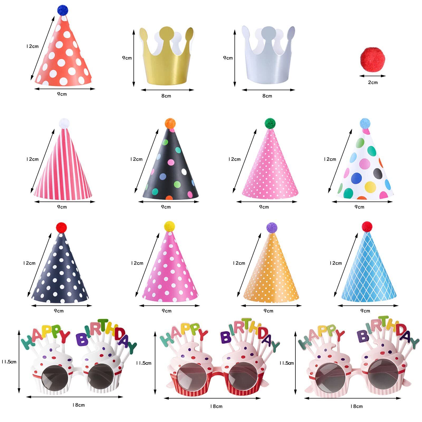 【セット内容】3個面白いパーティーメガネ(違うカラー)、パーティーハット9個(全て違う柄、高さ12cm円錐の直径9cm)、各王冠2個(ゴールド・シルバー)