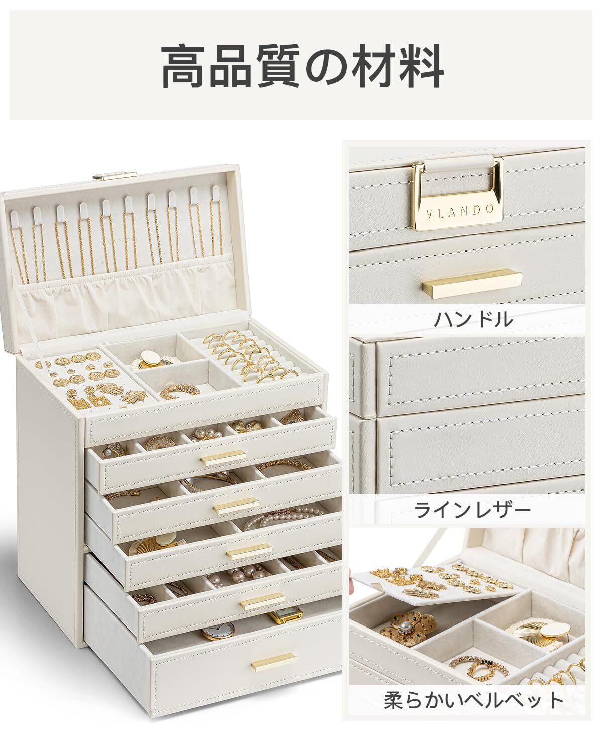 Vlando 大容量 ジュエリーボックス 6段式 引出し 小物入れ ピアス ネックレス 指輪 イヤリング 腕時計 収納 ケース(アイボリー)