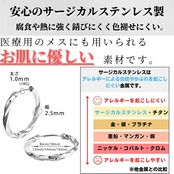 【素材】アレルギー対応のサージカルステンレス製です。腐食、高熱、酸化にも強く高い硬度を誇り、金属本来の美しい輝きを保ち続けることが可能です。1点1点丁寧に検品しておりますので、安心してご購入くださいませ