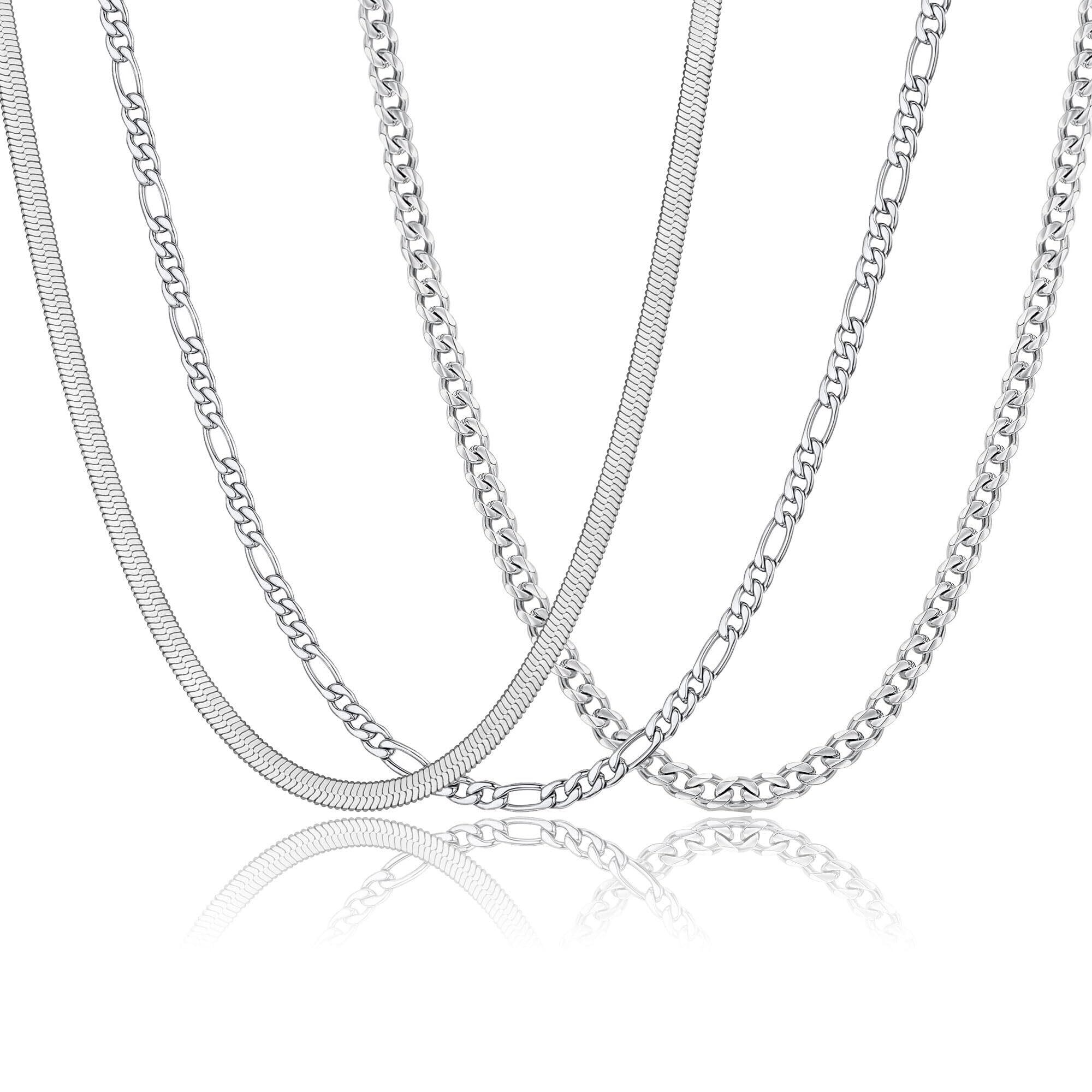 【3点セット】メンズネックレスは、キューバチェーン、フィガロチェーン、ヘリンボーンチェーンの3種類が含まれております。いずれも古典的なデザインで、単独での着用はもちろん、お好みのペンダントと組み合わせることができます。胸元を華やかに彩るジュエリーとして定番のアイテムがネックレスが個性を表現できます。
