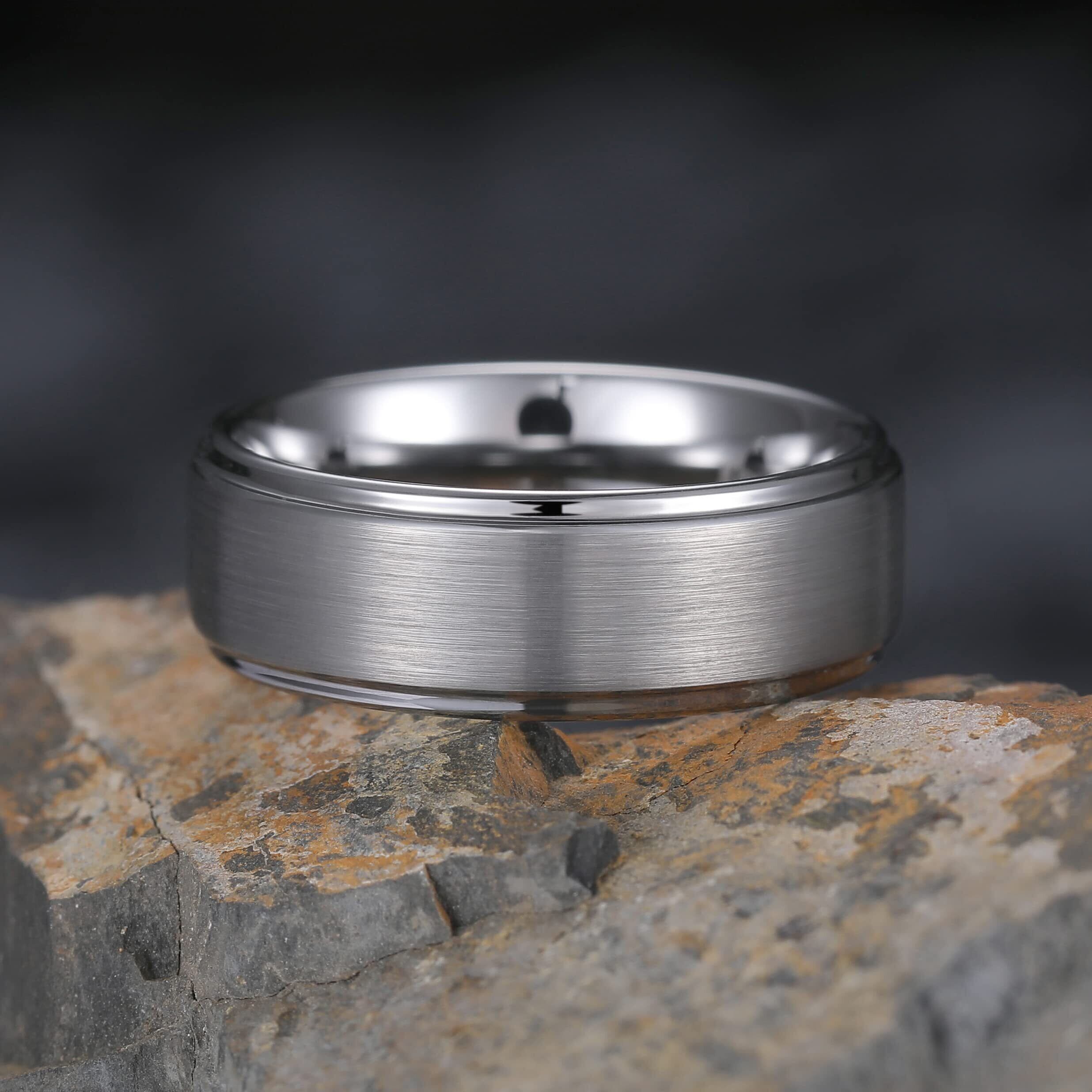 クラシックデザイン:8mm幅のメンズタングステンリング。ブラッシュ仕上げにベベルエッジを施し、内側は高光沢の仕上げが特徴です。