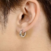 単色で仕上げられたシンプルなフープピアス。表面にカットが施されており、様々な角度から存在感を放ちます。ベーシックなシルバーカラーのピアスは普段使いにぴったりです。