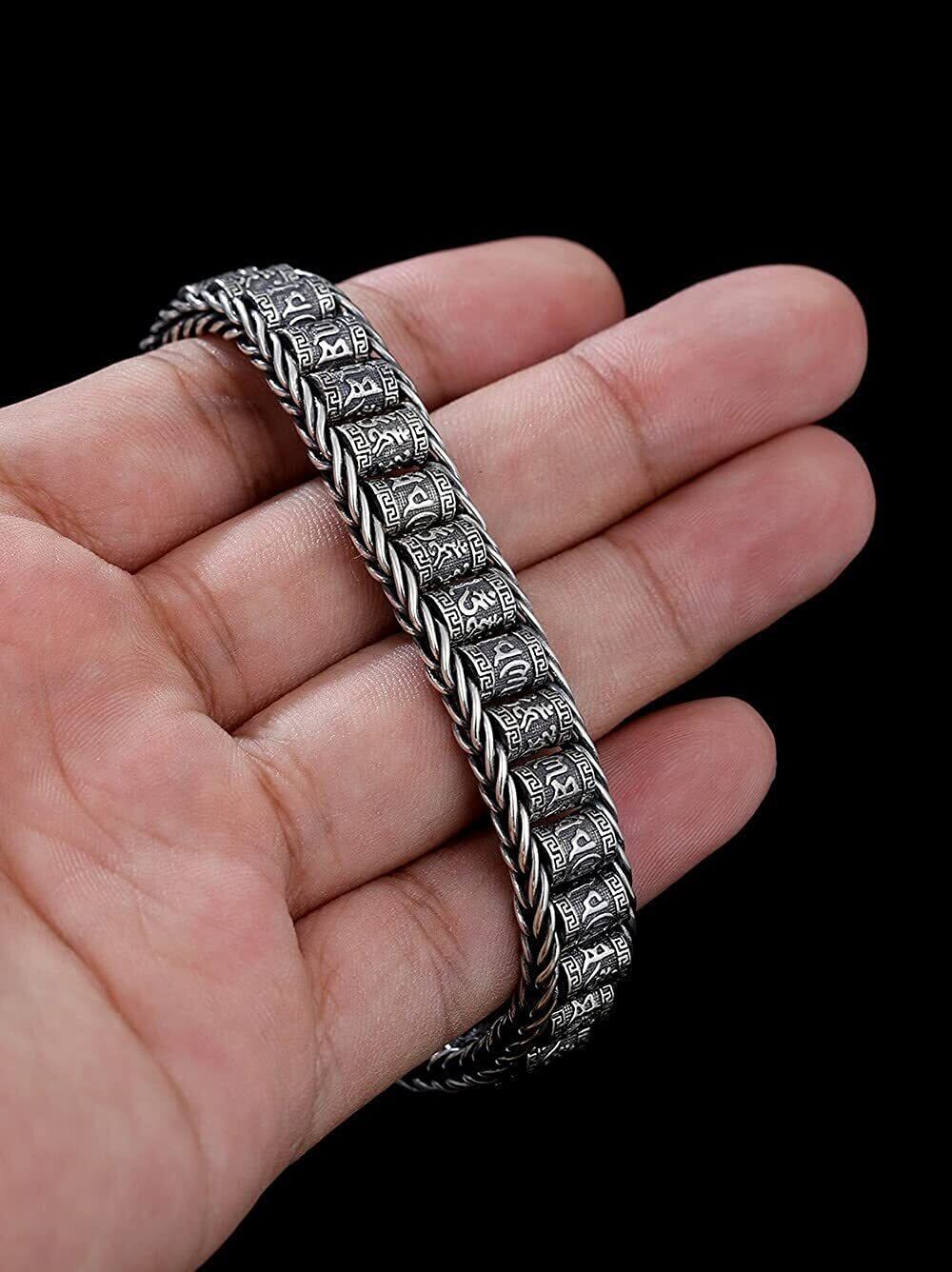 【心安らぐ真言ブレスレット!】「Rockyu」のシルバーブレスレットは、独特の中華回紋デザインと般若心経、六字真言が施された特別なアイテムです。ローラー式の回転可能デザインが特徴で、手首にすっきりとフィットし、身に着けるごとに開運のパワーを感じることができます。