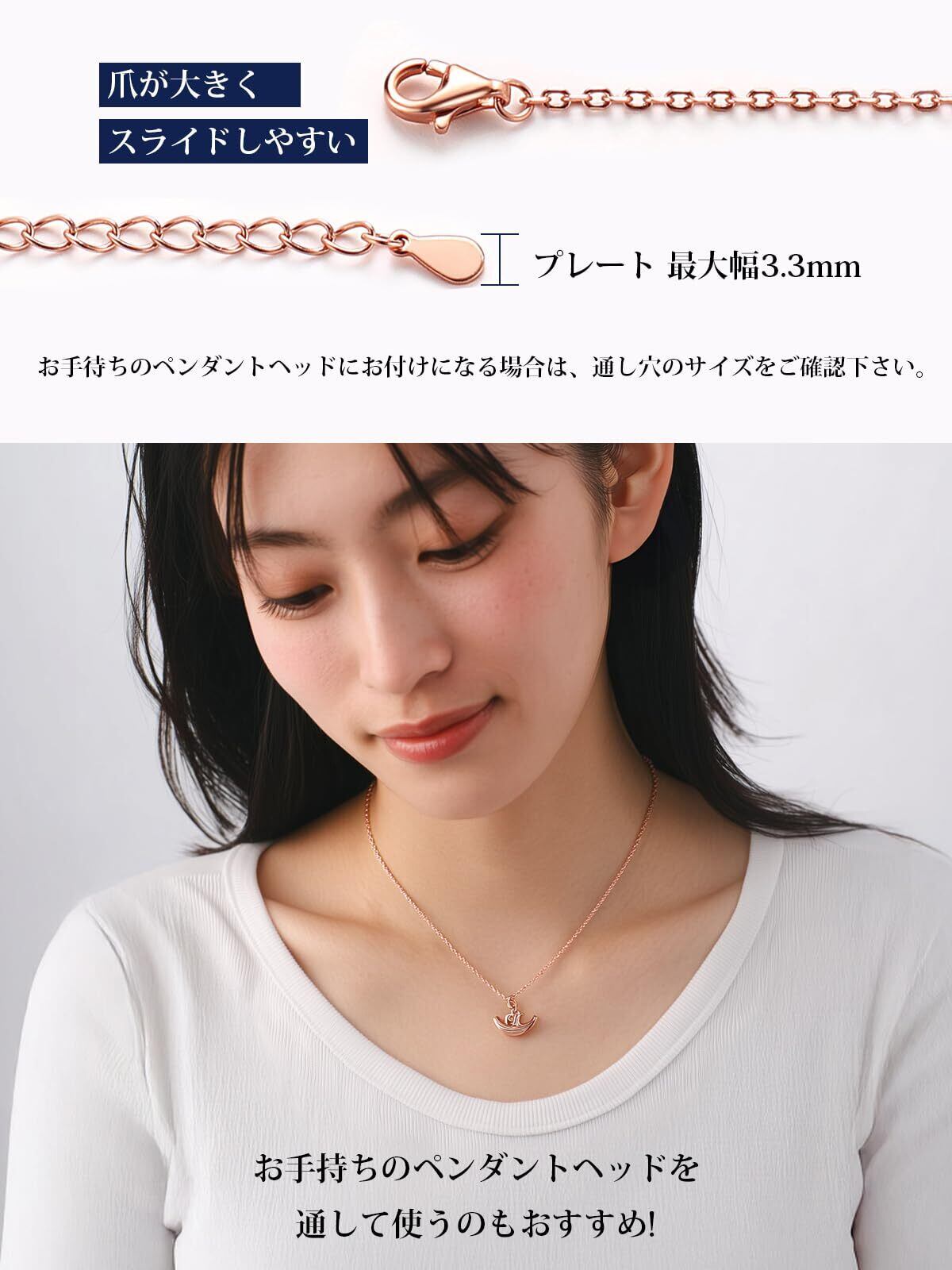 [定番の3色展開] 番で人気の3色よりお選びくださいませ。シャープな印象のシルバーネックレスチェーンはカジュアルスタイルに、キラキラ華やかなゴールドックレスチェーンはパーディーシーンに、やさしく女性らしいピンクゴールドックレスチェーンはワンピースたスカートスタイルにお使いいただけます。