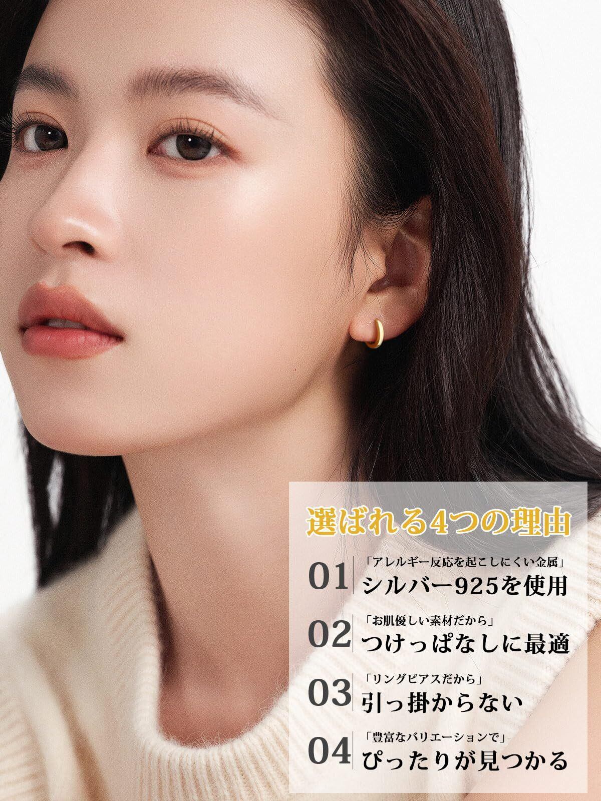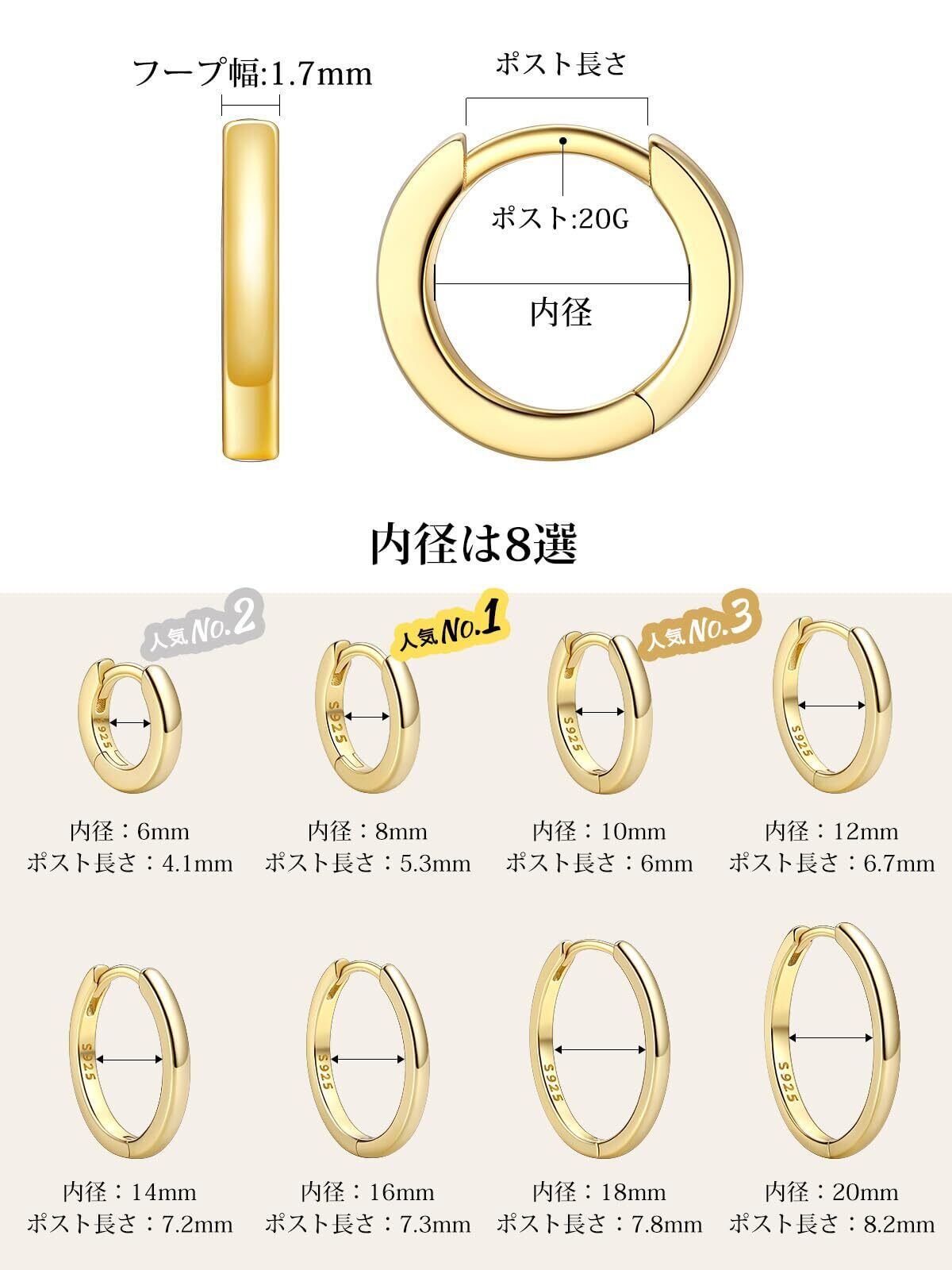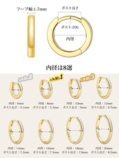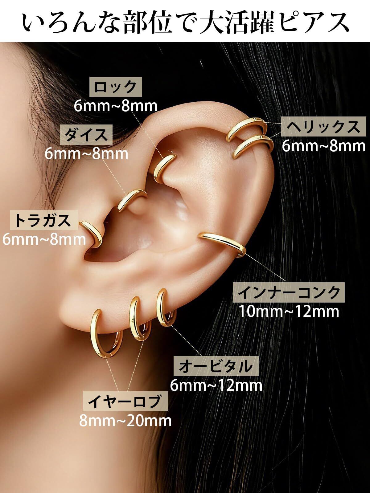 [小さなフープピアス] ピアスの幅は1.7mmで、内径は小ぶりな6mm~存在感を放つ12mmまで豊富なサイズ展開します。内径6mmのフープピアスは耳たぶが薄い方やピアスホール位置が低い方ににおすすめ。イヤーロブ・ヘリックス・トラガス・インナーコンク等の部位にもおすすめ。内径8mmのフープピアスはぴったり着けたい方ににおすすめ。内径10mm以上のフープピアスは大振りで着けたい方におすすめ。