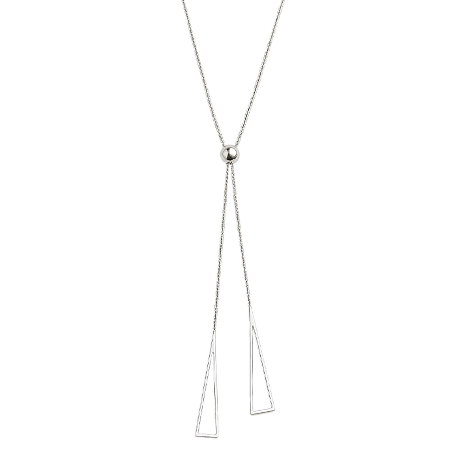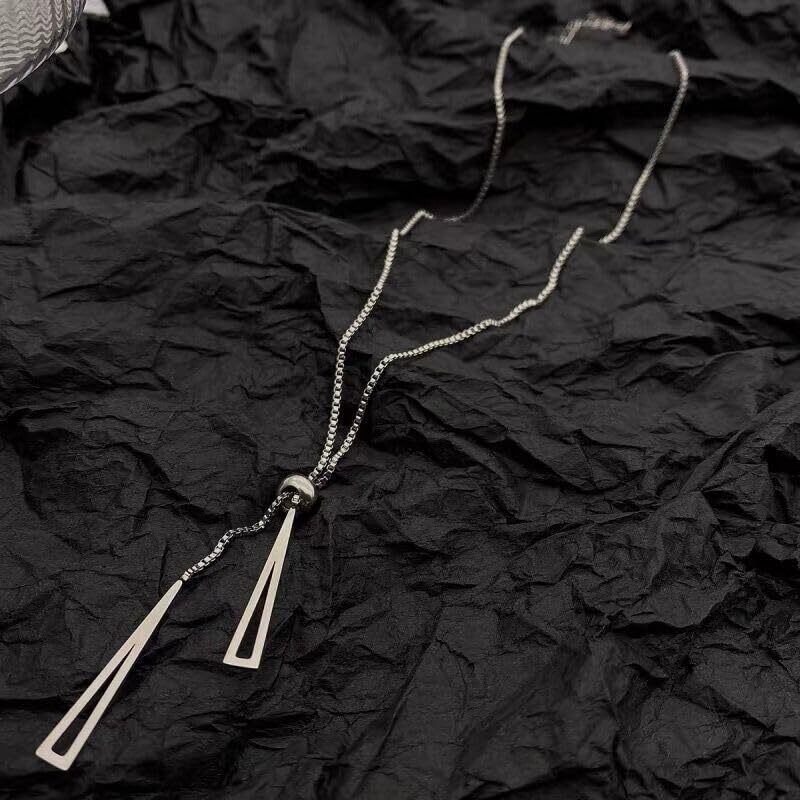 このアクセサリーは、幾何学的な三角形モチーフが特徴のラリエットネックレスです。シンプルで洗練されたフォルムに、スライド調整機能を備えており、ネックラインに合わせて自由にスタイルを変えられるのが魅力。チェーンには肌なじみのよい合金素材を採用し、表面は美しい電気メッキ仕上げ。どんなシーンにもなじみ、コーデの引き締め役として活躍します。