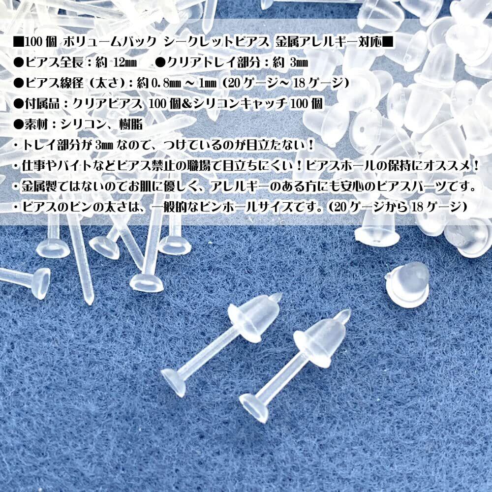 100個 シークレットピアス 目立たないピアス 透明ピアス 樹脂ピアス 学校や仕事、バイトなど、目立たずにピアスホール維持出来る クリアピアス バレないピアス 金属アレルギー対応 ピアスホールのキープ ピアス パーツ スタッドピアス シリコンキャッチ ハンドメイドアクセサリー【森の雑貨屋さん】 ■シークレットピアス 目立たないピアス 透明ピアス 学校や仕事、バイトなど、目立たずにピアスホール維持出来る■ ●ピアスサイズ:長さ12mm(トレイ3mm) ●ピアス太さ(ゲージ):0.8mm(20ゲージ) ●内容量:100個(クリアピアス100個、キャッチ100個) ●素材:シリコン、樹脂(金属アレルギーフリー) ・学校や仕事、バイトなどピアス禁止の場所で目立ちにくいクリアタイプのピアスです ・目立たないのでピアスがバレにくく、ピアスホールの保持におすすめです。 ・シリコンと樹脂素材なので、お肌にも優しく、アレルギーがある方にも安心のピアスパーツです。 ・ピアスの太さは一般的な太さの20ゲージ。 使いやすいピアスです ・小さなトレイ(3mm)付きなので、カボションなどを貼り付けてオリジナルピアス制作にも使えるピアスパーツです。