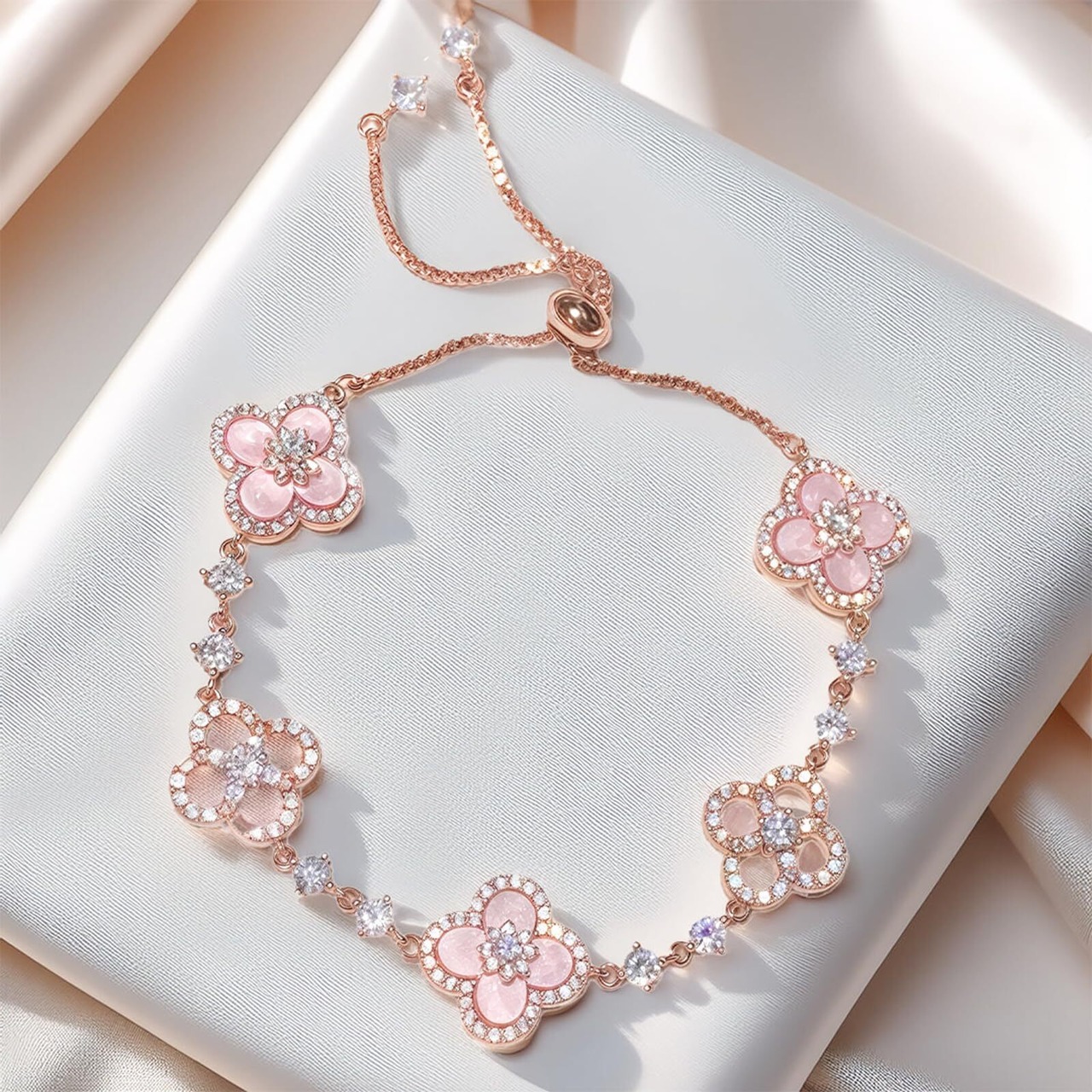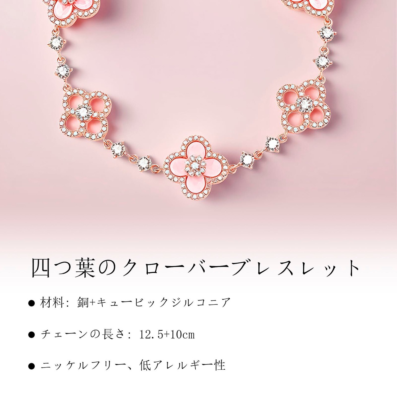 【ピンクの四つ葉のクローバーブレスレット】:光沢のある18Kゴールドメッキとキラキラ輝くピンクの天然貝を使用した、繊細な四つ葉のクローバーブレスレット。耐久性と控えめなエレガンスを兼ね備えています。低刺激性素材を使用しているので、敏感肌にも快適にお使いいただけます。