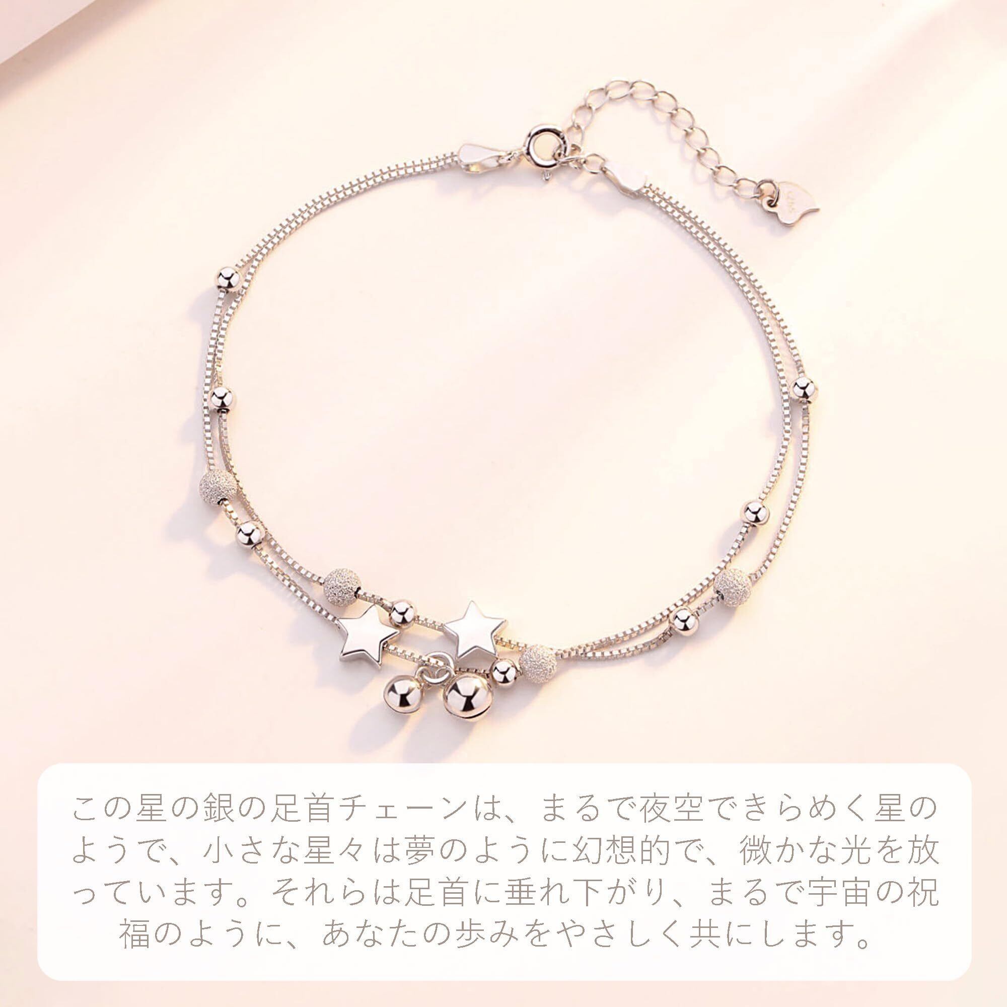 【神秘的な輝きを放つ美しいアンクレット!】この[シルバーサンダー] アンクレットは、925シルバーを使用し、足首をエレガントに彩ります。デザインには星と五芒星が施され、幸せや祈りを象徴する意味を込めています。2連のボールチェーンが絶妙な重なりを生み出し、どんなスタイルにもマッチします。あなたのファッションに特別なタッチを加えます。