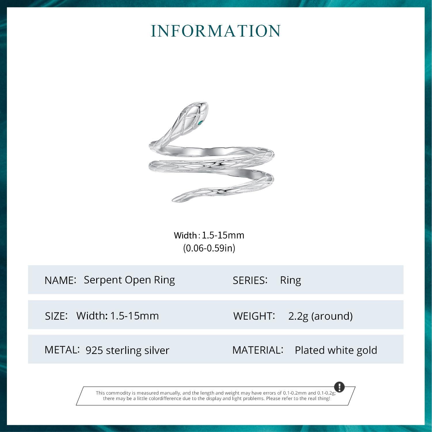 【Rockyu リング】スネークリング レディース 925純銀 ホワイトゴールドメッキ 調節可能なデザイン。幅1.5-15mmのユニークな蛇の形状で、重さは約2.2gです。ジルコン装飾が輝きを加えています。