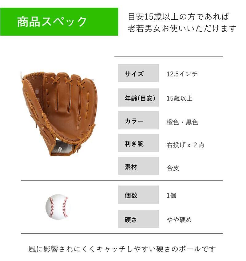 【グローブ】 ・サイズ:12.5インチ ・年齢(目安):15歳以上 ・カラー:橙色・黒色 ・利き腕:右投げ×2点 ・素材:合皮