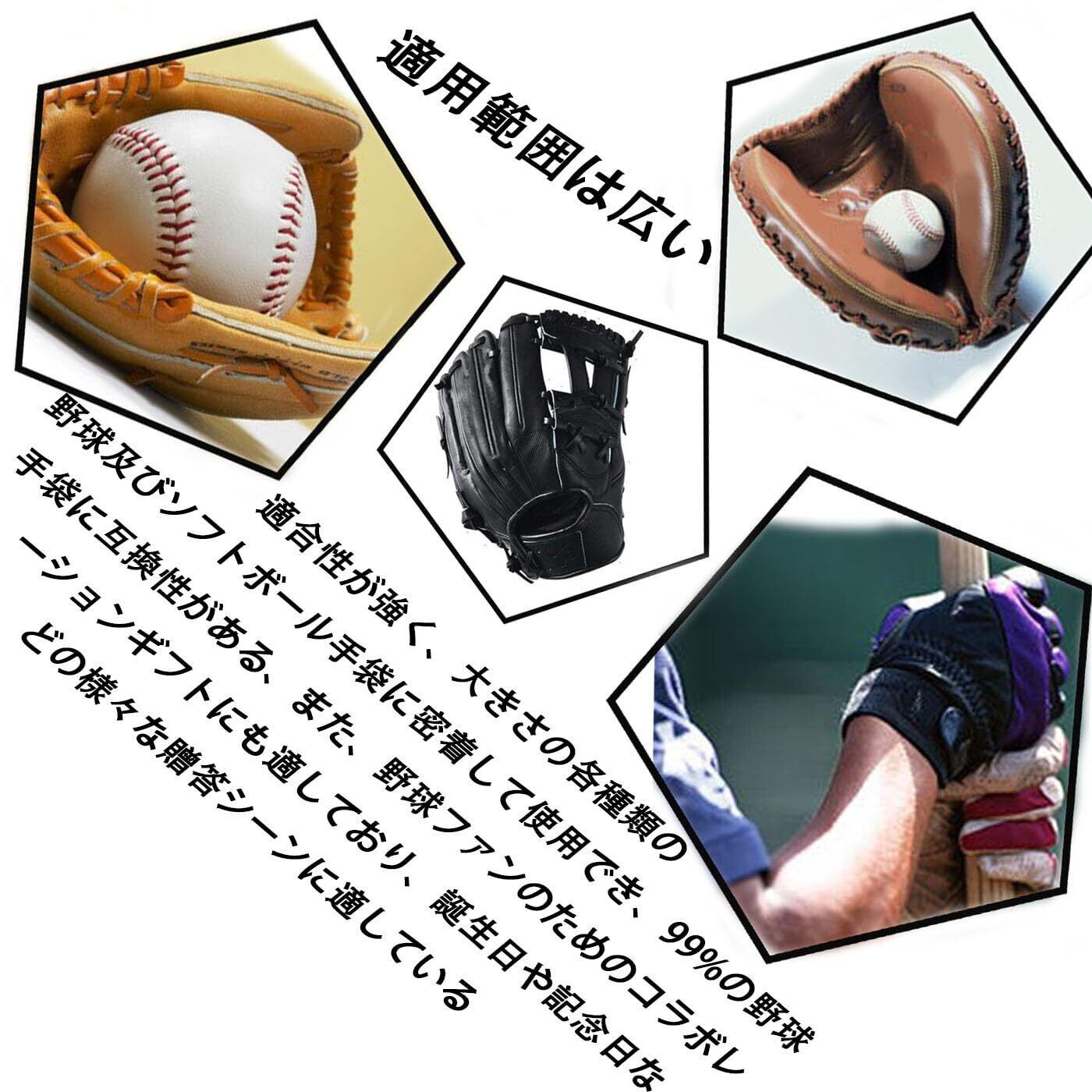 適用範囲は広い:適合性が強く、大きさの各種類の野球及びソフトボール手袋に密着して使用でき、99%の野球手袋に互換性がある、また、野球ファンのためのコラボレーションギフトにも適しており、誕生日や記念日などの様々な贈答シーンに適している