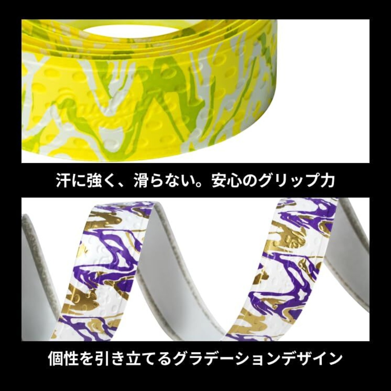 【特徴】テープ表面の凸凹加工によりグリップ力を高め、野球・ソフトボールバットのグリップの向上に最適! 汗を吸収して滑りにくく、適度な弾力性を持ちながら優れた耐久性! グラデーション グリップテープ
