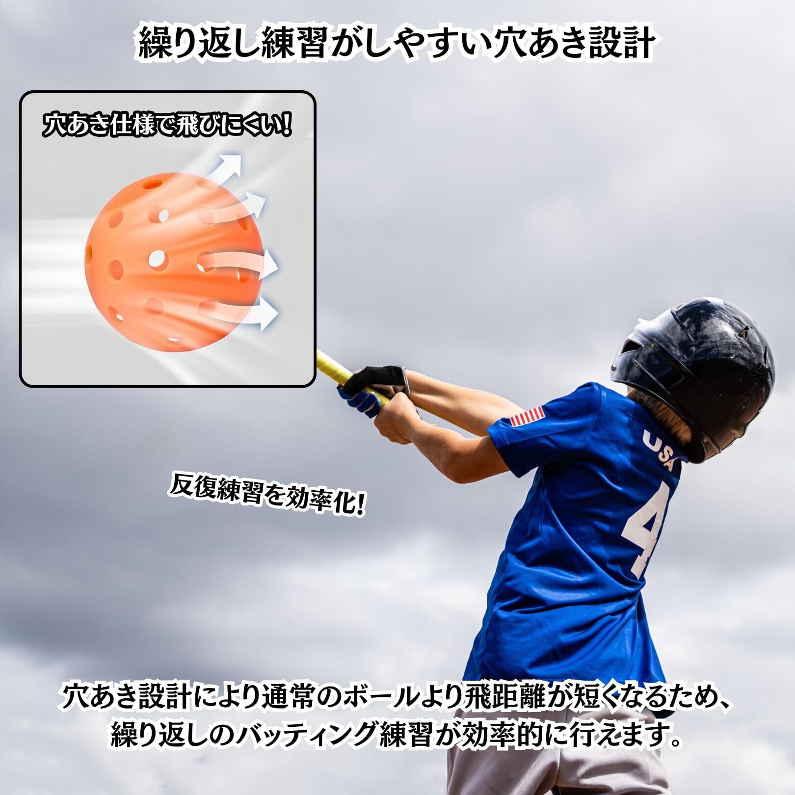 【繰り返し練習を効率化】穴あき設計により、通常のボールより風抵抗を受けて飛距離が短くなるため、繰り返しのバッティング練習が効率的に行えます。コンスタントな練習を通じてスイングの精度や力強さを向上させ、実践での打撃力アップに繋げることができます。