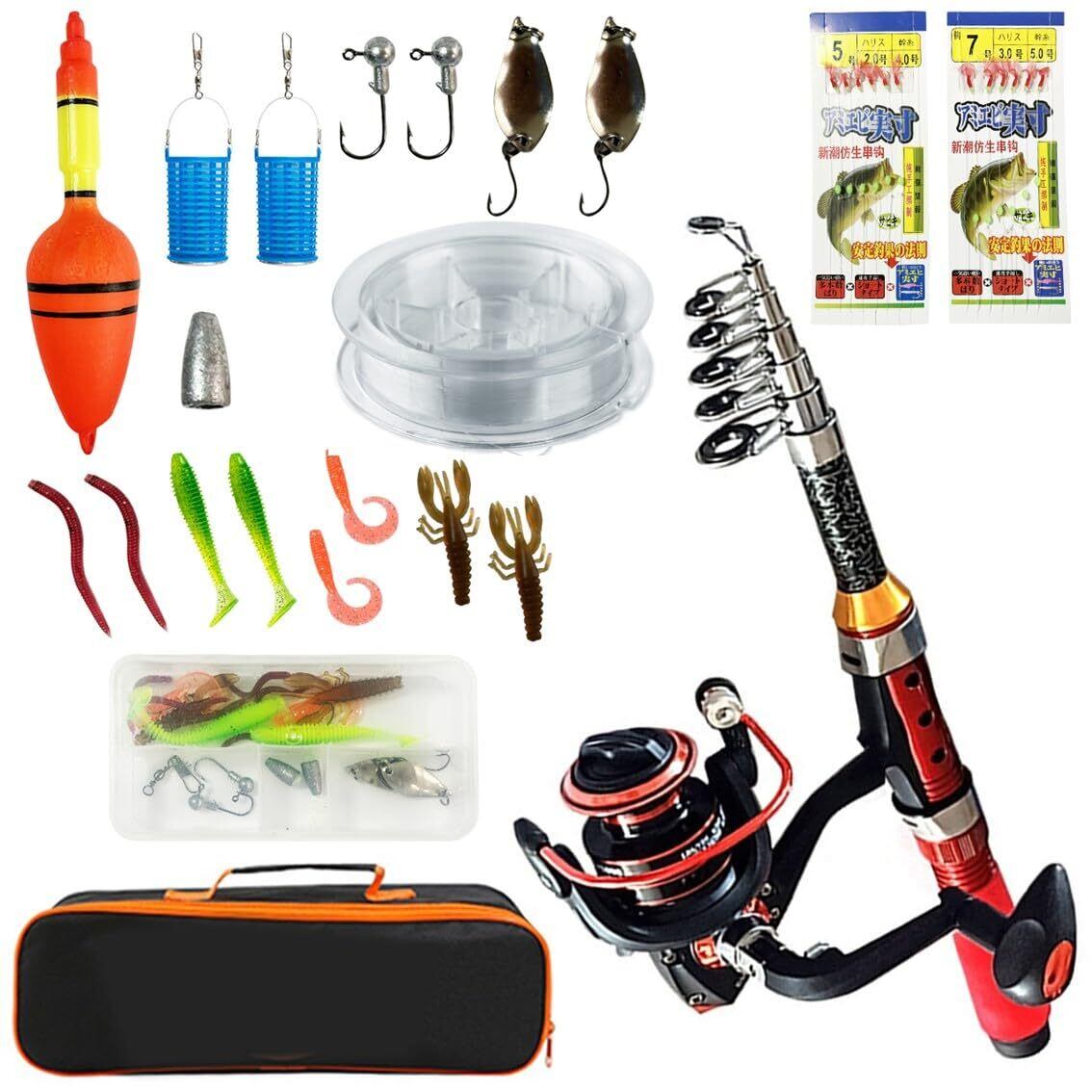 セット内容: 伸縮式釣り竿、スピニングリール、ルアー、サビキ仕掛け、釣り糸、その他釣り具小物が専用バッグに収納