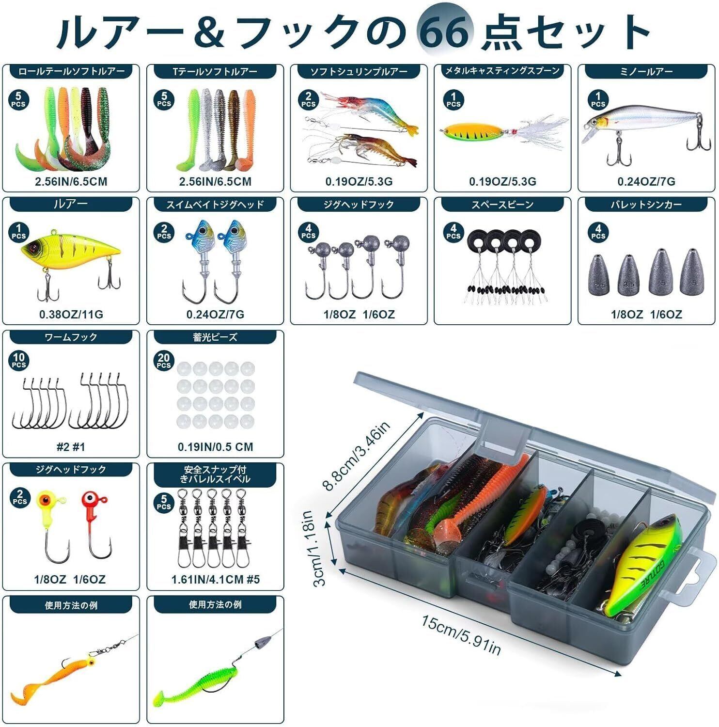 【セット内容物】2.1m炭素振り出し竿×1、3000番スピニングリール×1、2.0号4本編み150mPEライン×1、ハードルアー×5、3.4gジグヘッド×3、ブレードフック×10、ワーム(ソフトルアー)×46、エビ×3、釣り小物×34、フック×4、ガイドライン×2、釣り用鈴×1、フィッシュグリップ×1、パワープライヤー×1、ルアー収納ケース×1、ロッドセット収納バッグ×1