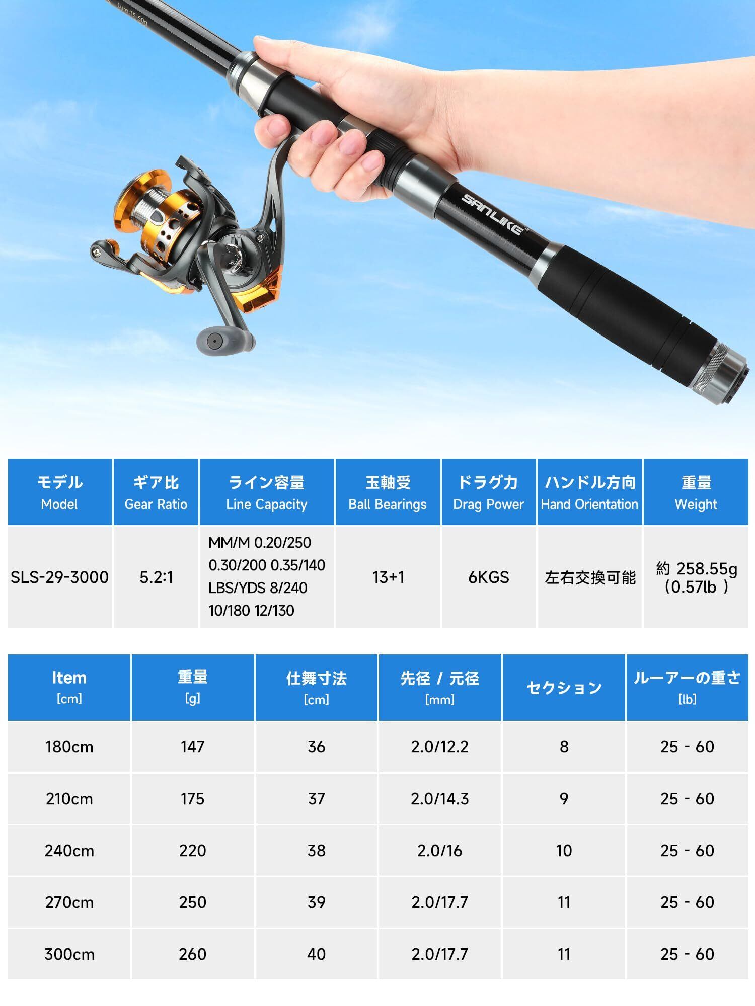 短くてコンパクト:サンライクの釣り竿はコンパクトに设计され、折りたたみするとわずか43センチメートルになり、重量はわずか146gで、持ち運びと収納がとても簡単で、いつでもどこでもお釣りを楽しむことができます。適合ライン番号と餌重のデータについては、画像の表を参照してください